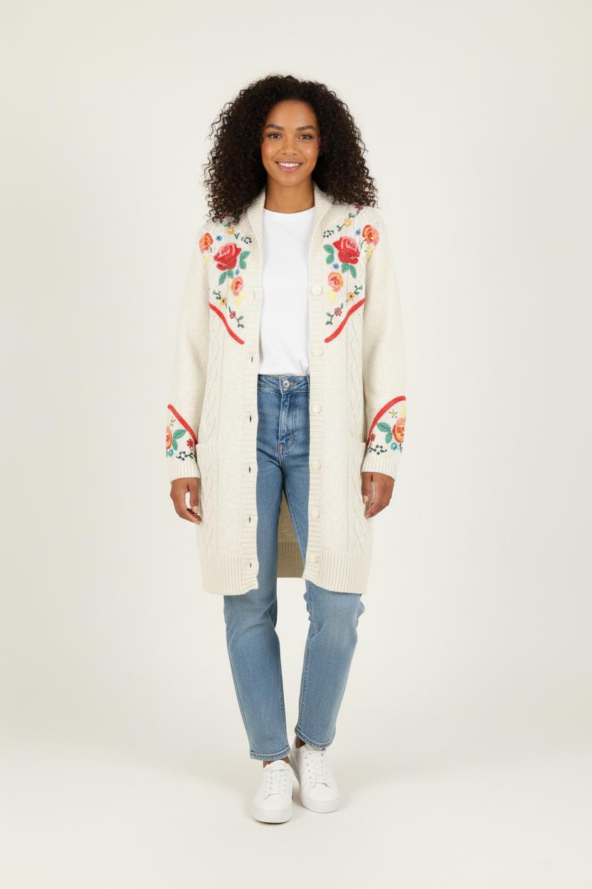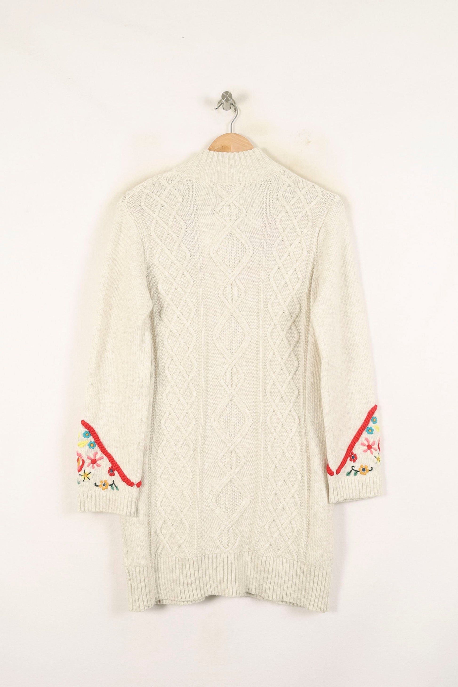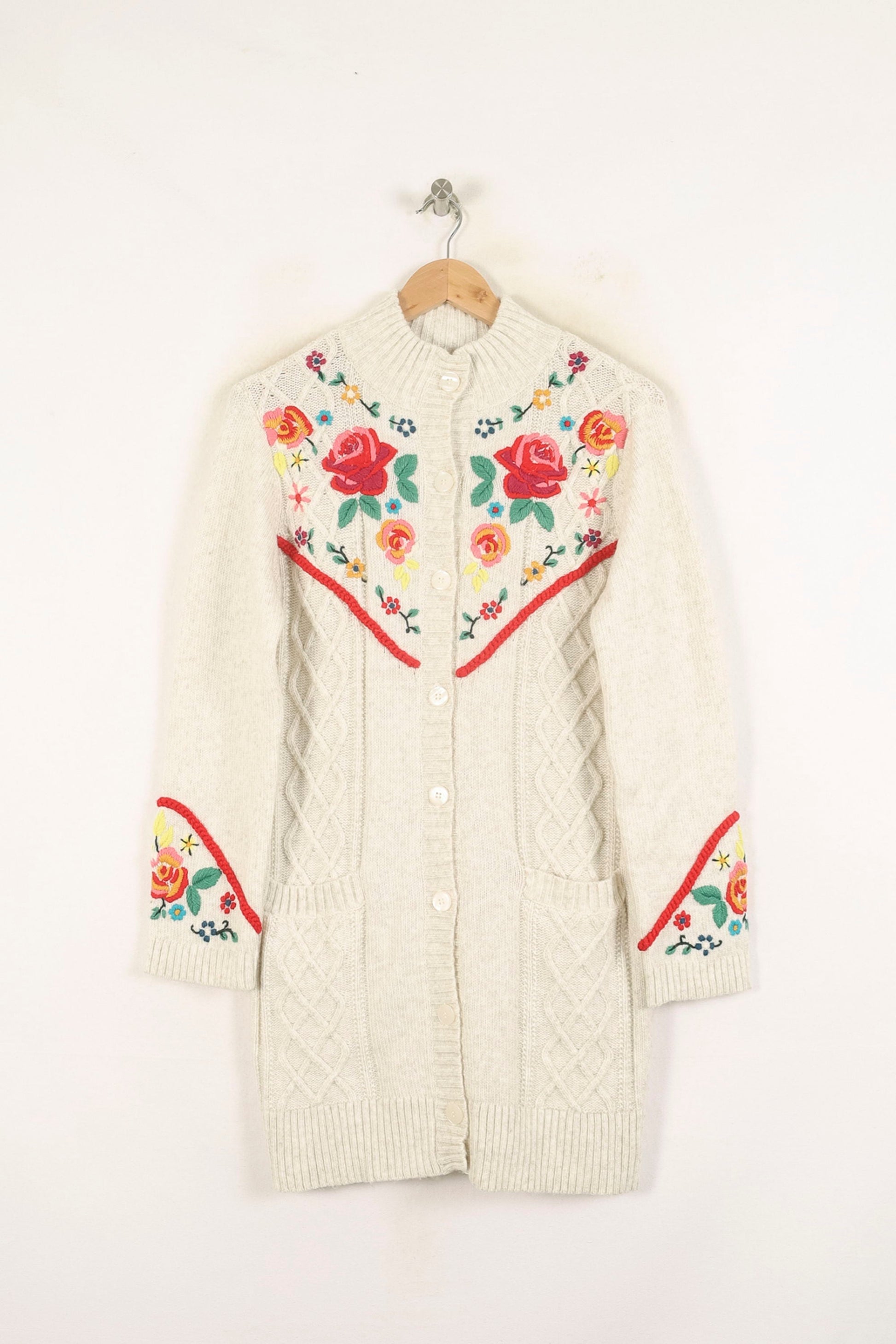Cardigan blanc en maille à broderies florales colorées Derhy, taille S/36. Confectionné dans une maille douce à motif torsadé, ce modèle se distingue par ses broderies florales multicolores sur les épaules et les manches, ainsi que ses finitions côtelées et son boutonnage devant, qui lui confèrent une allure unique et raffinée. Idéal pour une promenade printanière ou pour ajouter une touche bohème à une tenue décontractée.
