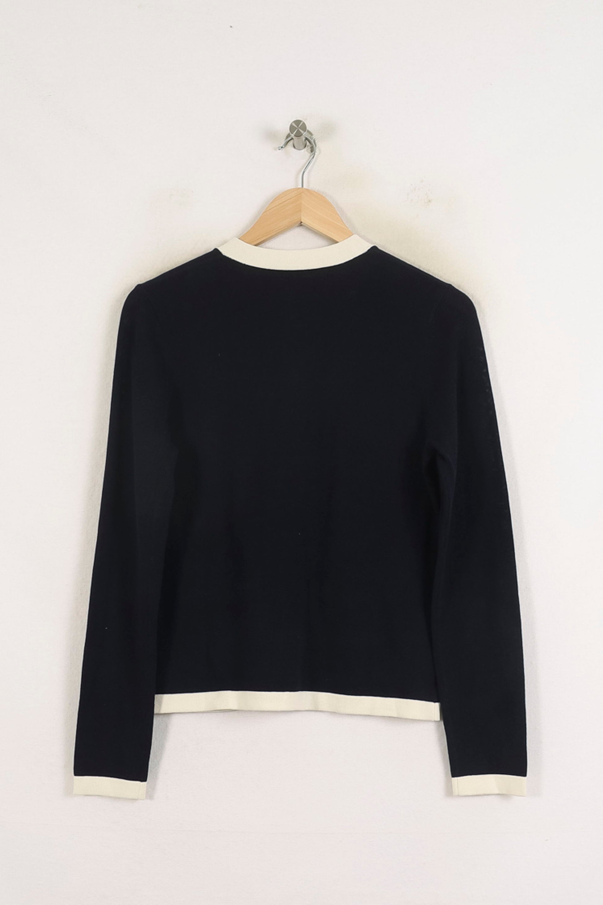 Cardigan bleu femme Ines de la Fressange Paris taille S/36, à manches longues, finition contrastée blanche et boutons dorés. La matière maille fine et douce, associée à des finitions soignées, des décoratives et des boutons dorés signature, confère à ce cardigan élégance et raffinement intemporel. Idéal pour une réunion professionnelle ou une soirée jeune et chic en ville.