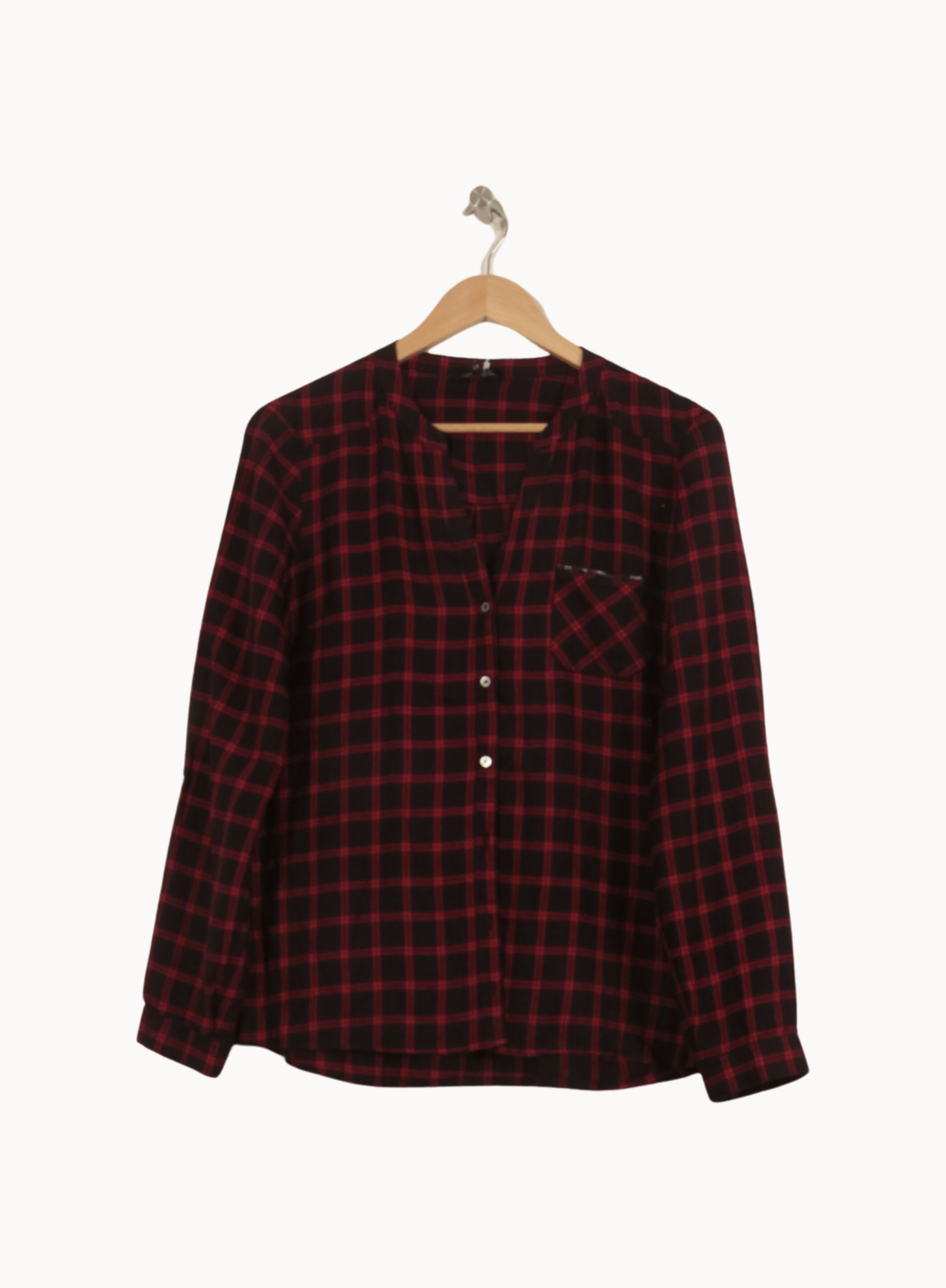 Chemise à carreaux bordeaux Caroll, taille XL/42, un top élégant et confortable signé par la marque. Confectionnée dans une matière douce à motifs carreaux rouges et noirs, cette chemise se distingue par sa coupe fluide, son encolure ouverte sans col classique, ses boutons discrets sur le devant et sa poche poitrine cousue en biais, ajoutant une touche moderne et raffinée. Idéale pour une journée de travail décontractée ou un brunch entre amis, elle s’adapte parfaitement à toutes vos occasions casual chic.