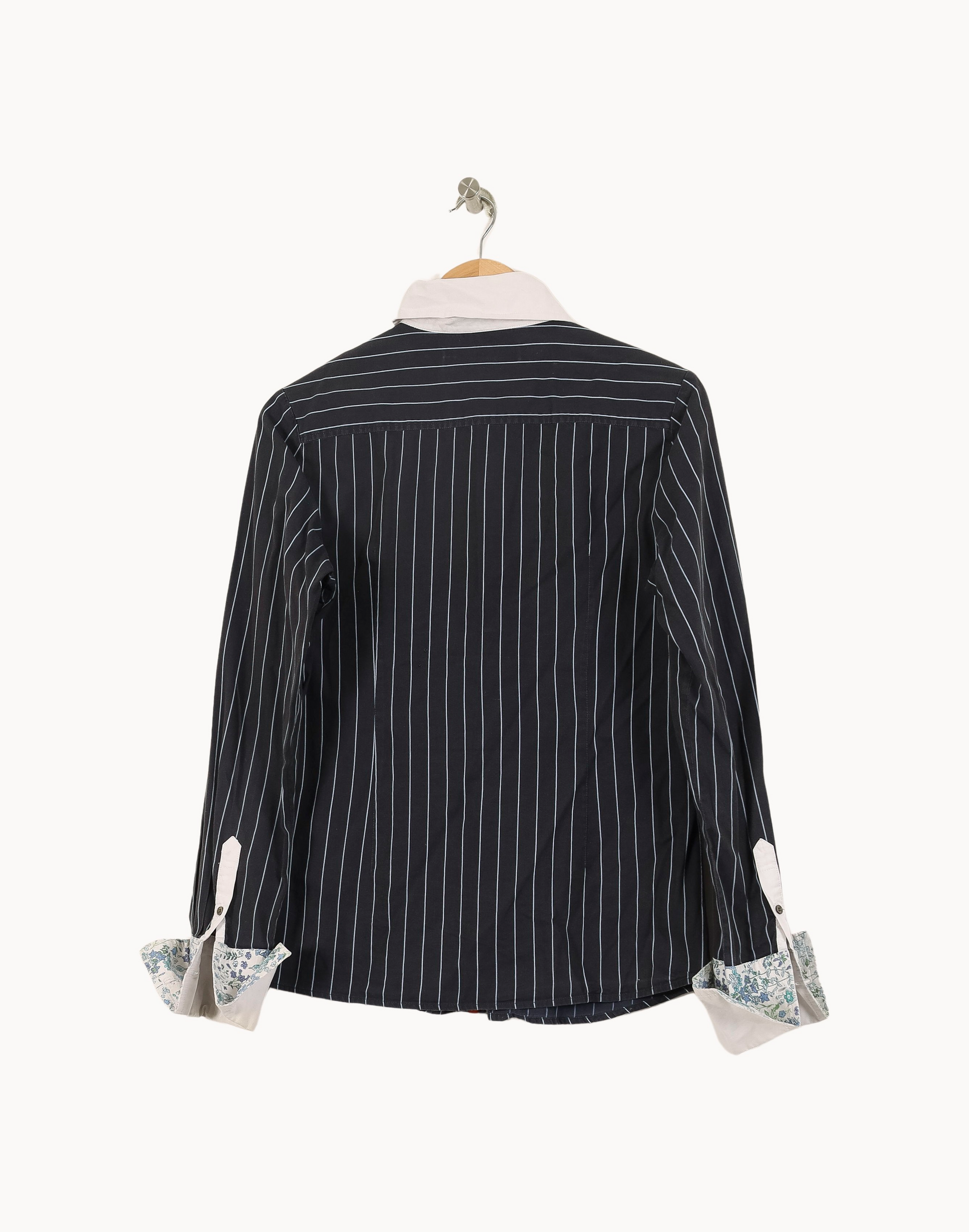 Chemise Lee bleu à fines rayures blanches, taille M/38, modèle à manches longues – un classique revisité pour un look raffiné. Confectionnée dans une matière légère, la chemise se distingue par son col et ses poignets contrastants en blanc, ainsi que par sa coupe droite élégante et sa fermeture boutonnée apparente. Parfaite pour une journée de travail au bureau ou un rendez-vous professionnel où l’élégance décontractée est de mise.