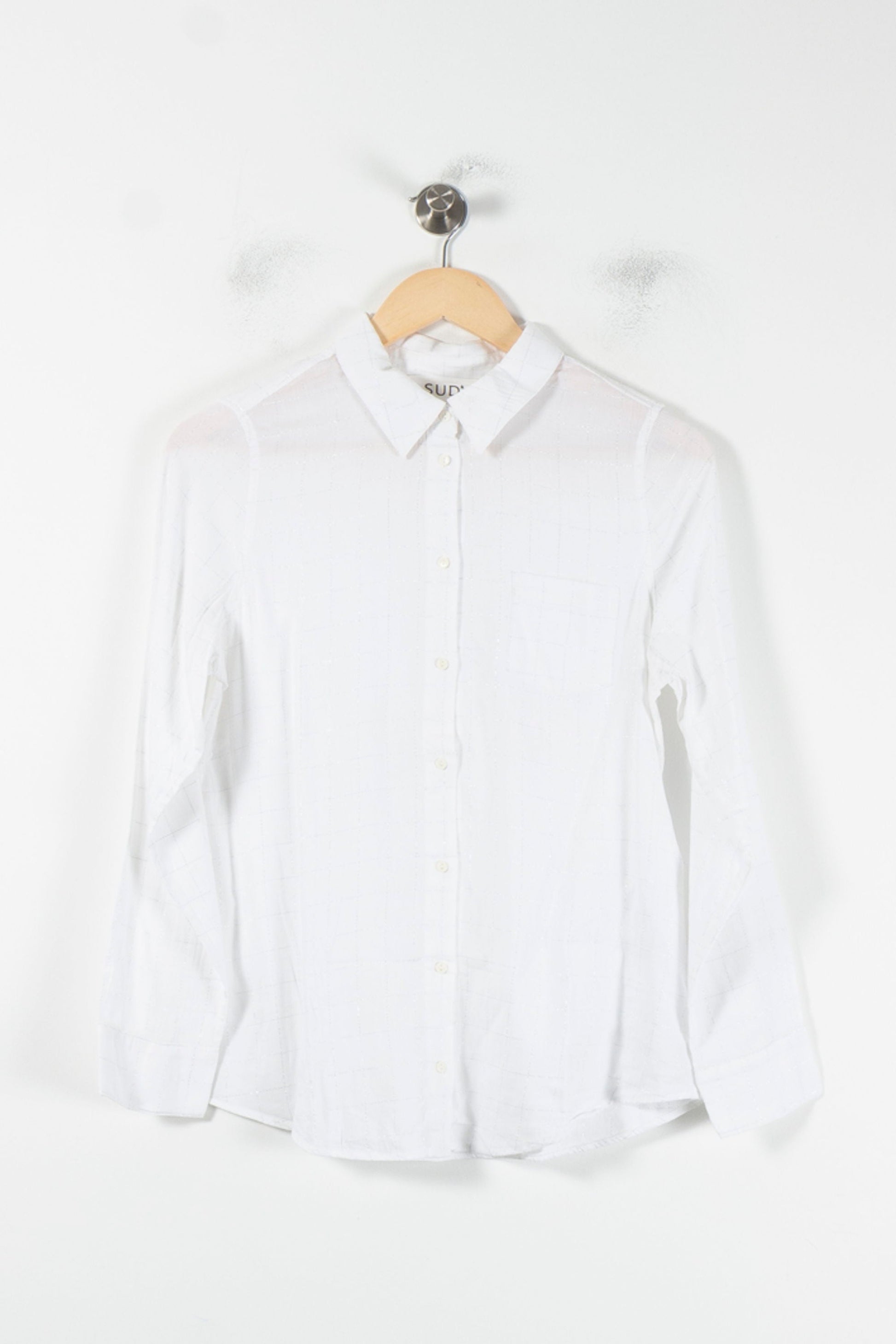 Chemise blanche manches longues Sud Express, taille M/38, au style épuré et classique. Confectionnée dans un mélange de 55% coton, 44% viscose et 1% polyester, cette pièce se distingue par sa légèreté et son tombé naturel, rehaussés par la discrète texture quadrillée du tissu et une poche poitrine. Idéale pour une journée au bureau ou un rendez-vous décontracté en ville.