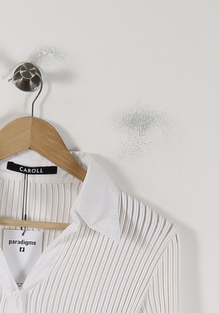 Top Caroll à manches longues, taille S/36, coupe ajustée, alliant élégance et modernité. Confectionné dans une matière fluide en 92% polyamide et 8% élasthanne, il se distingue par son tissu plissé, son col chemise structuré et ses poignets boutonnés, qui apportent une touche sophistiquée et féminine. Idéal pour une journée au bureau ou un dîner dans un cadre raffiné.