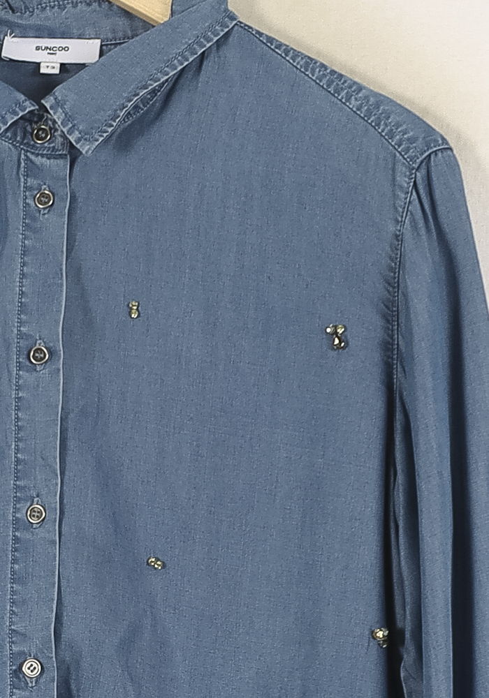 Chemise en denim bleu Suncoo, ornée de délicates perles, taille L/40 – un indispensable chic pour votre dressing. Confectionnée dans une toile légère de denim bleu, elle se distingue par ses détails de perles cousues qui apportent une touche raffinée et originale à une pièce classique. Idéale pour une journée décontractée élégante ou un déjeuner entre amis, cette chemise sublime subtilement toutes les silhouettes.