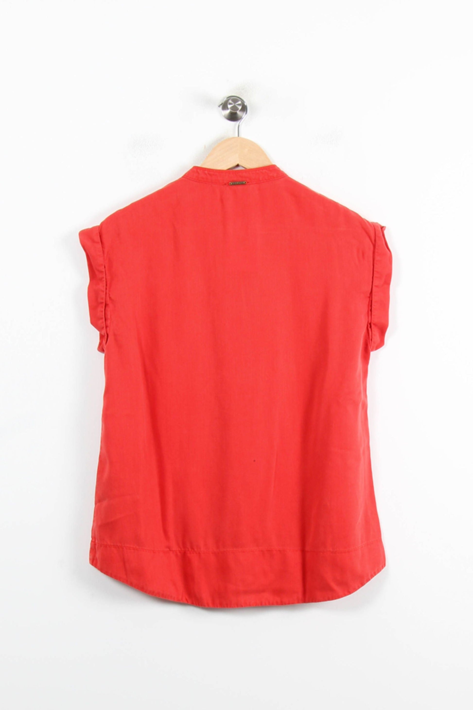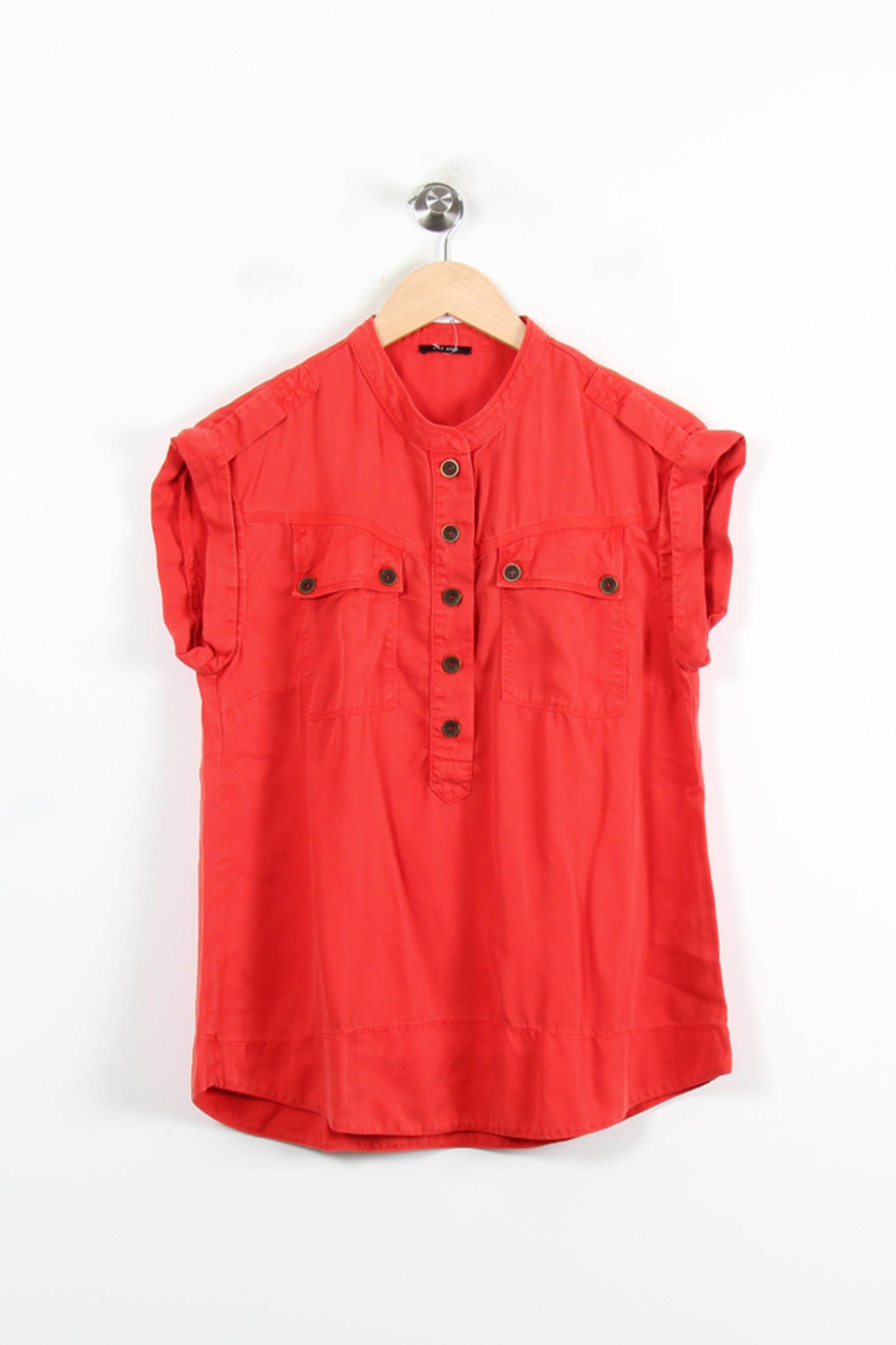 Top orange One Step taille L/40, chic et casual, à manches courtes et boutons apparents sur le devant. Confectionné dans une matière fluide, ce modèle est agrémenté de deux poches poitrine à rabat boutonné et de revers élégants sur les manches, offrant un raffinement subtil et une allure moderne. Idéal pour une journée au bureau ou une sortie estivale décontractée.