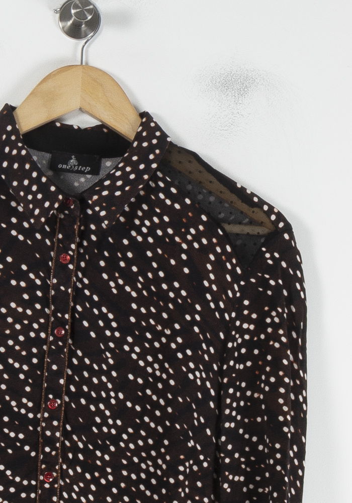 Blouse à manches longues One Step, taille XL/42, de couleur marron à motif à pois, idéale pour une allure élégante et décontractée. Confectionnée en 100% cupro, cette pièce se distingue par sa texture douce et légère, ainsi que par ses empiècements transparents sur les épaules qui ajoutent une touche d’originalité et de raffinement. Parfaite à porter lors d’une réunion professionnelle ou d’un déjeuner entre amis pour afficher un style sophistiqué tout en préservant un confort optimal.