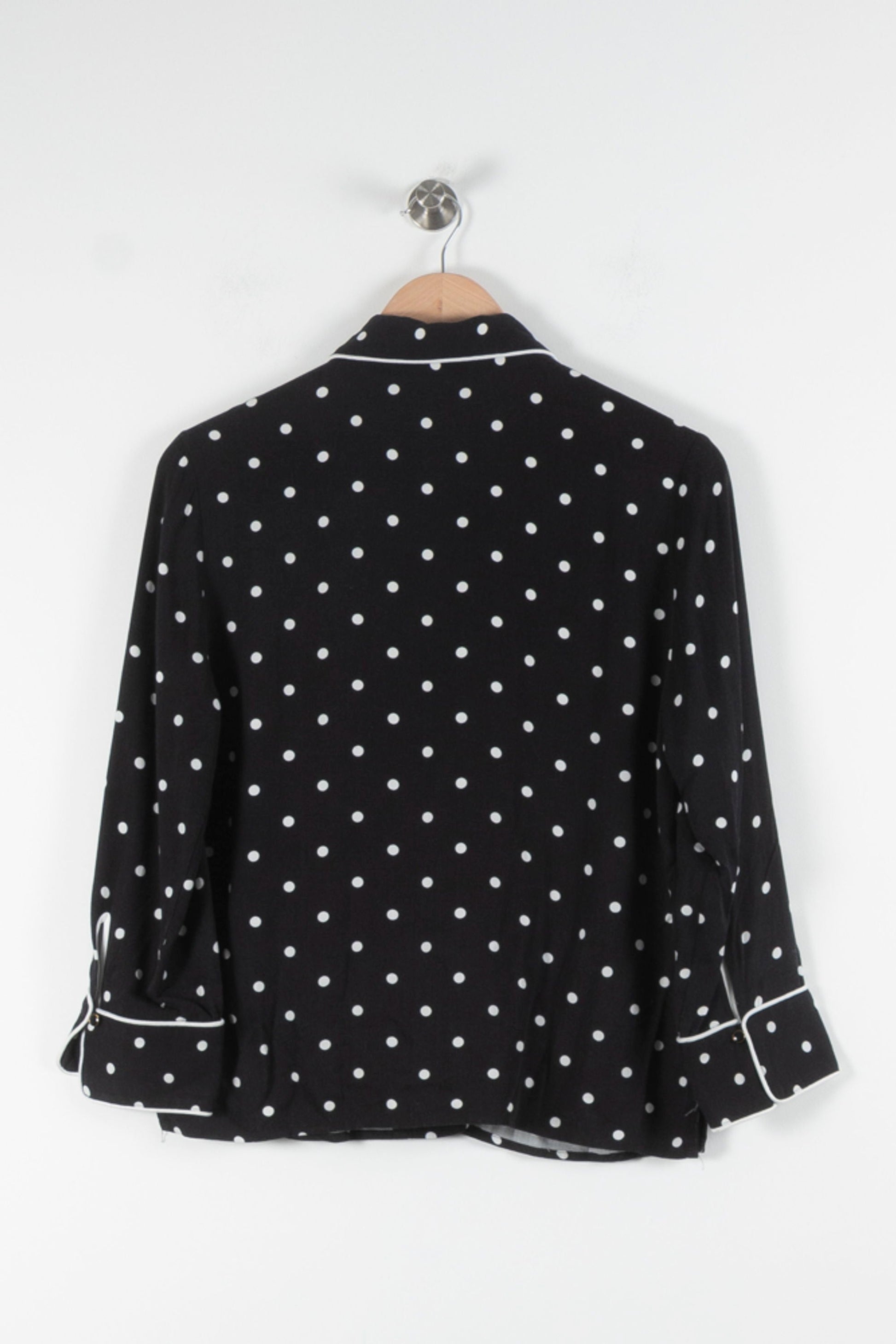 Chemise noire à pois blancs Galeries Lafayette, taille M/38, Top élégant au style intemporel de la marque emblématique. Dotée d'une finition à pois blancs et de passepoils contrastés blancs sur le col, la poche et les manches, cette pièce se distingue par ses détails raffinés et sa coupe souple, offrant un charme classique et sophistiqué. Parfait pour une journée au bureau ou une sortie décontractée entre amis avec une allure chic et confortable.