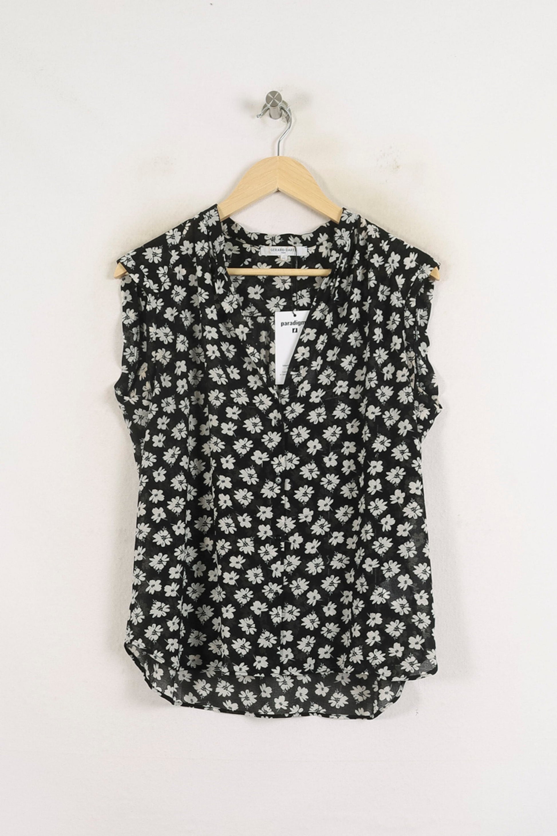 Top sans manches à imprimé floral noir et blanc Gerard Darel, taille XL/42, élégance intemporelle. Confectionné dans une matière fluide, ce haut présente un col en V et un motif fleuri délicat qui apporte une touche d’originalité et de féminité à la silhouette. Idéal pour une journée au bureau ou une sortie estivale décontractée, porté avec un pantalon clair ou une jupe.