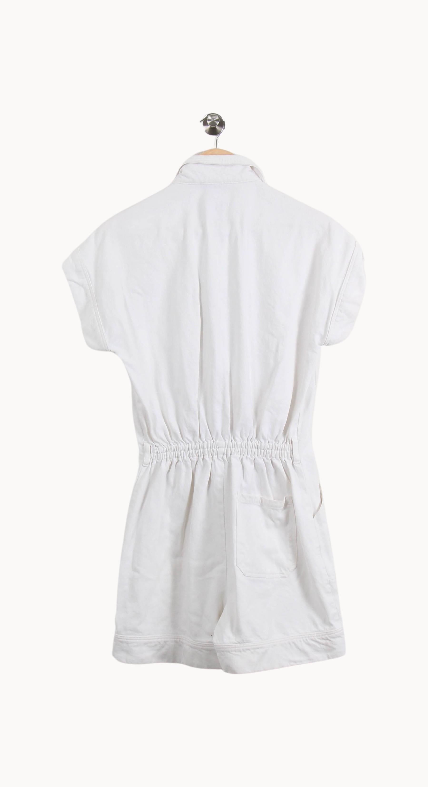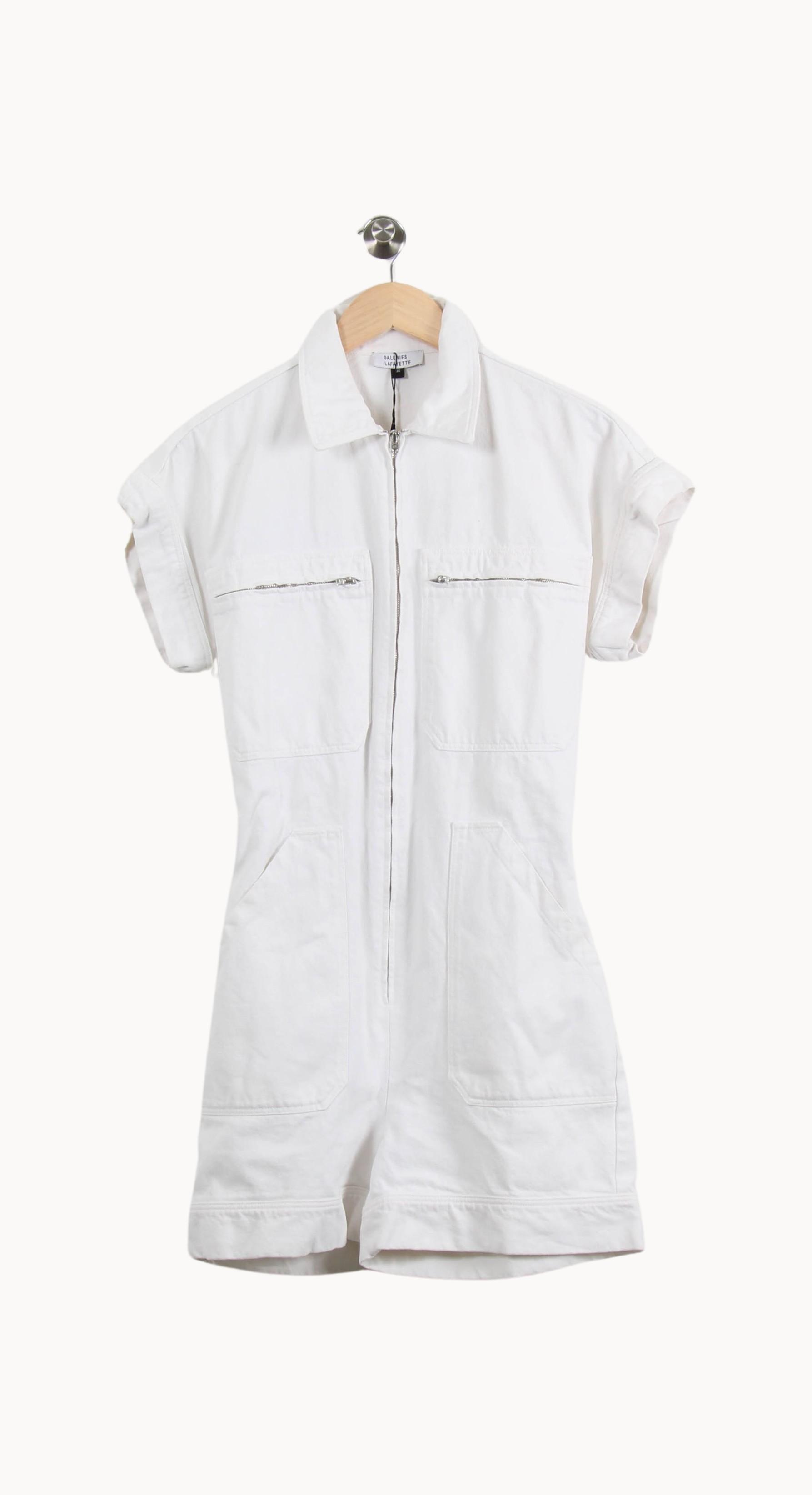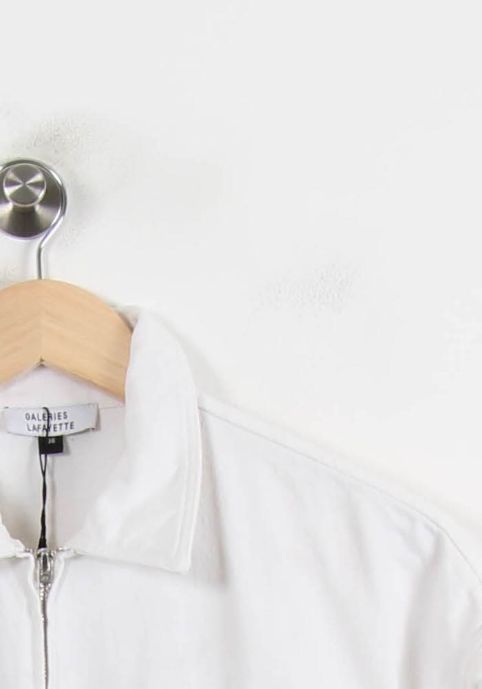 Combinaison courte blanche Galeries Lafayette en taille S/36, dotée d’un col chemise, de manches courtes et d’une fermeture zippée sur le devant. Confectionnée dans une matière à l’aspect structuré, cette combinaison se distingue par ses poches poitrine zippées et ses deux grandes poches latérales, apportant une touche moderne et pratique à la pièce. Idéale pour une journée citadine estivale ou un brunch décontracté entre amis.