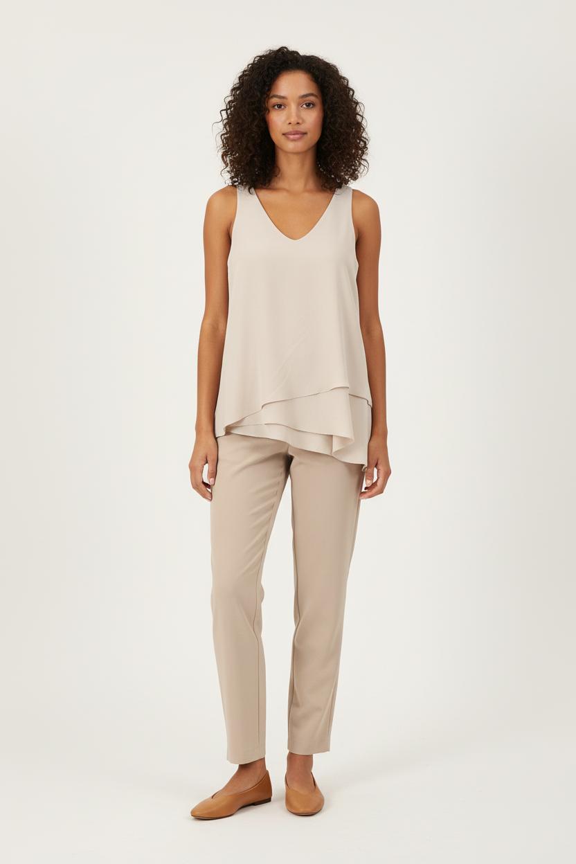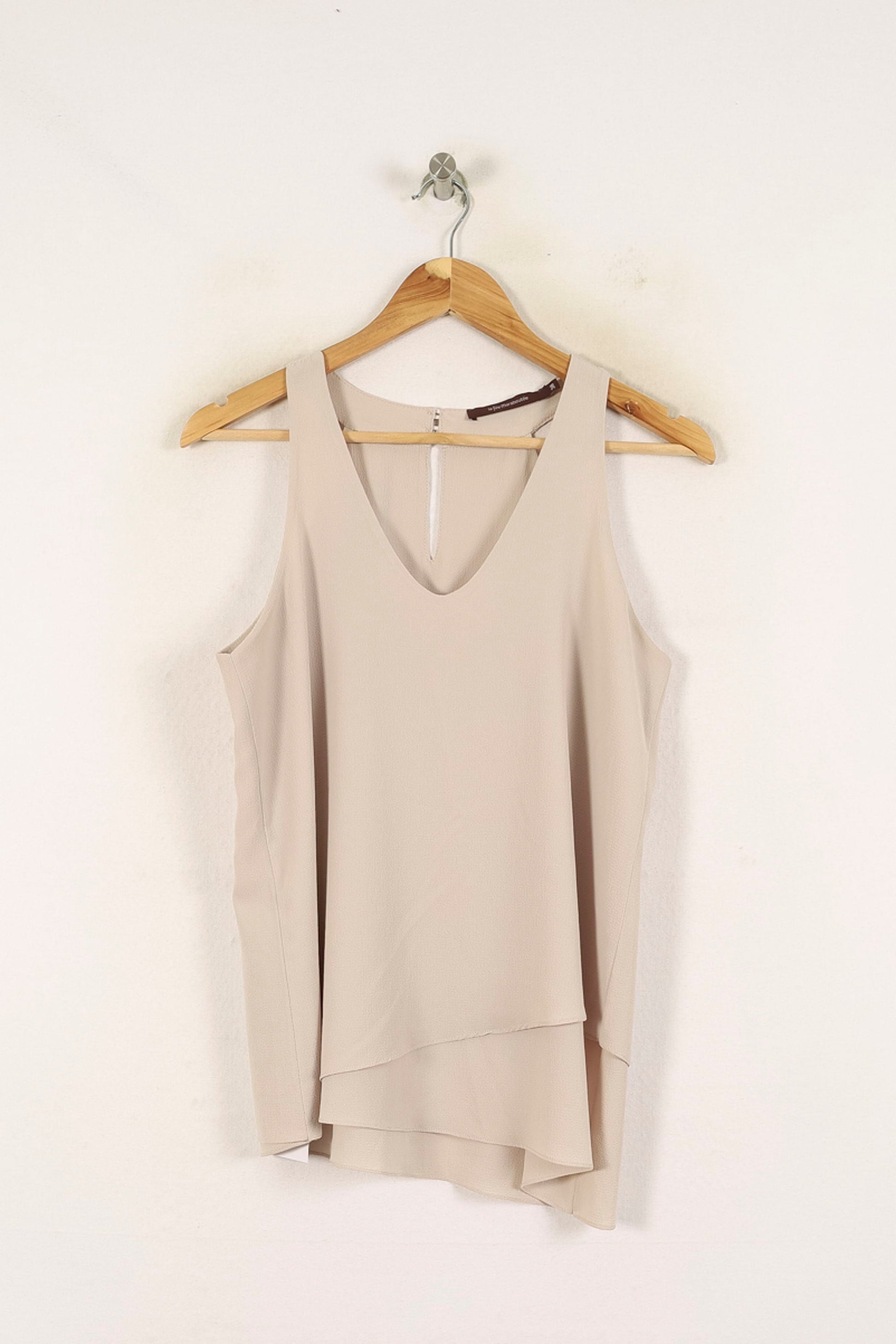 Top sans manches beige La Fée Maraboutée, taille M/38, à la coupe fluide et à l’encolure en V. Sa matière légère et sa superposition asymétrique offrent un tombé raffiné et gracieux, mettant en valeur l’élégance minimaliste et la qualité de la confection. Idéal pour une tenue de bureau estivale ou pour un dîner en terrasse accompagné d’un pantalon chic.