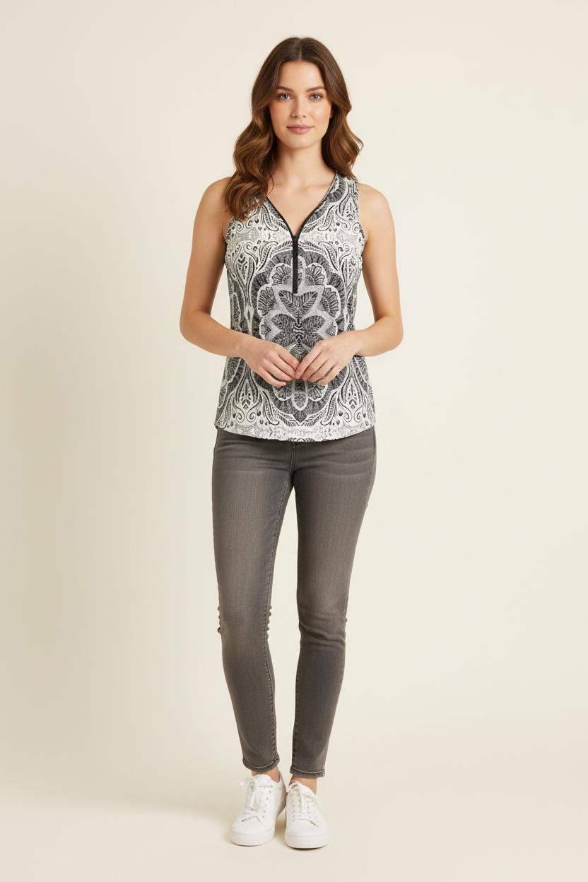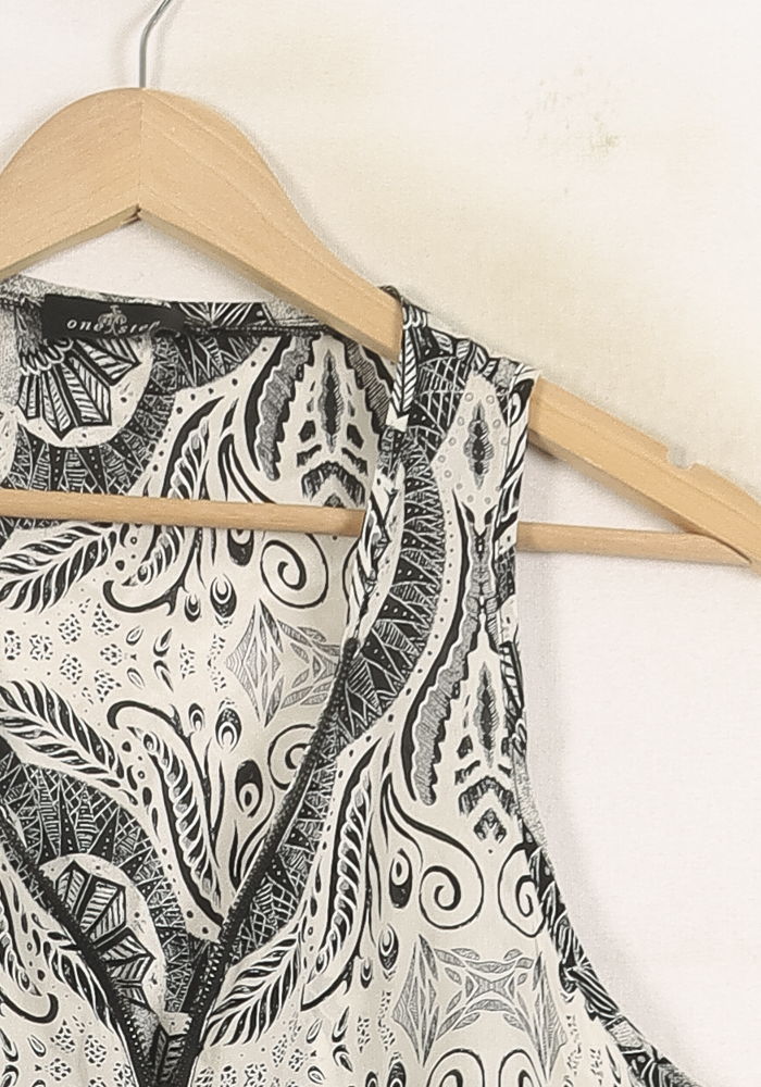 Top sans manches One Step, taille XL/42, blanc à imprimé graphique noir, élégant et moderne. Conçu dans une matière fluide et légère, ce top se distingue par son motif artistique symétrique et son col en V zippé, apportant une touche d’originalité et de raffinement. Idéal pour une journée estivale en ville ou pour sublimer un look de bureau décontracté.