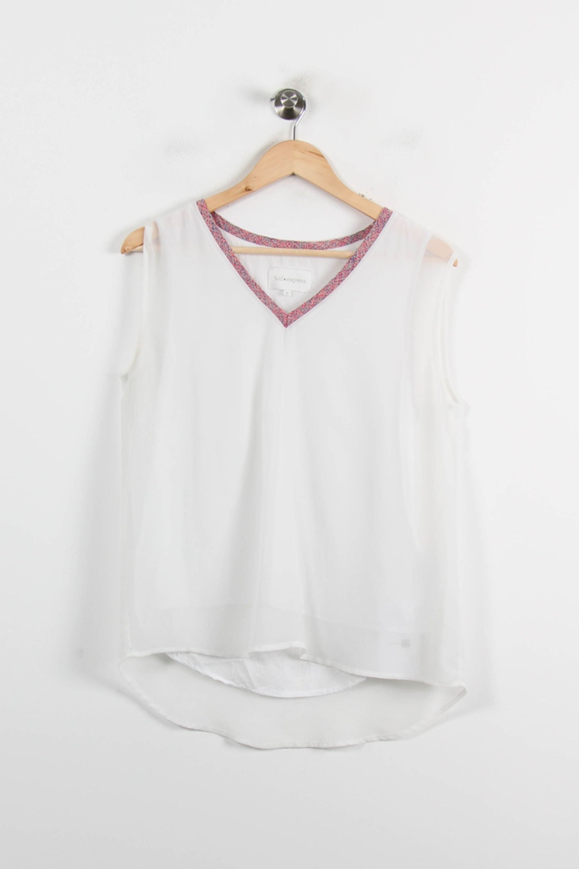 Top sans manches blanc Sud Express, taille M/38, au col V décoré d’un liseré imprimé rose, élégant et féminin. Confectionné dans une matière légère et fluide, ce haut se distingue par ses finitions raffinées et son col contrastant qui apporte une touche d’originalité subtile. Idéal pour une journée estivale ou une sortie décontractée, il se porte facilement avec un pantalon habillé ou un jean pour une allure chic et moderne.