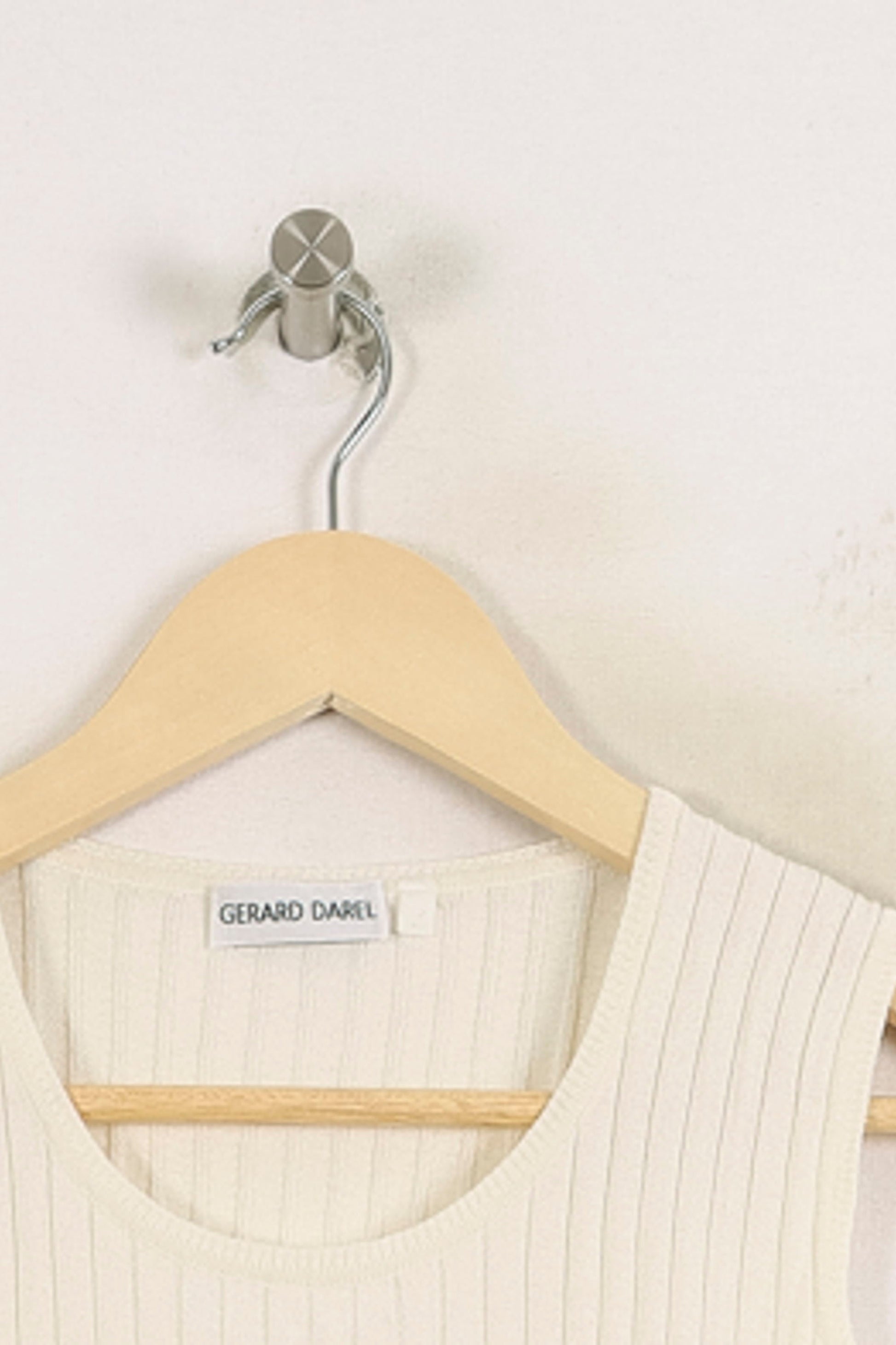 Top sans manches blanc Gerard Darel, taille L/40, caractérisé par une coupe droite et un design épuré. Confectionné dans une maille côtelée, il séduit par sa texture subtile et son élégante simplicité, qui lui confèrent un style moderne et raffiné. Idéal pour une réunion professionnelle ou une sortie estivale chic.