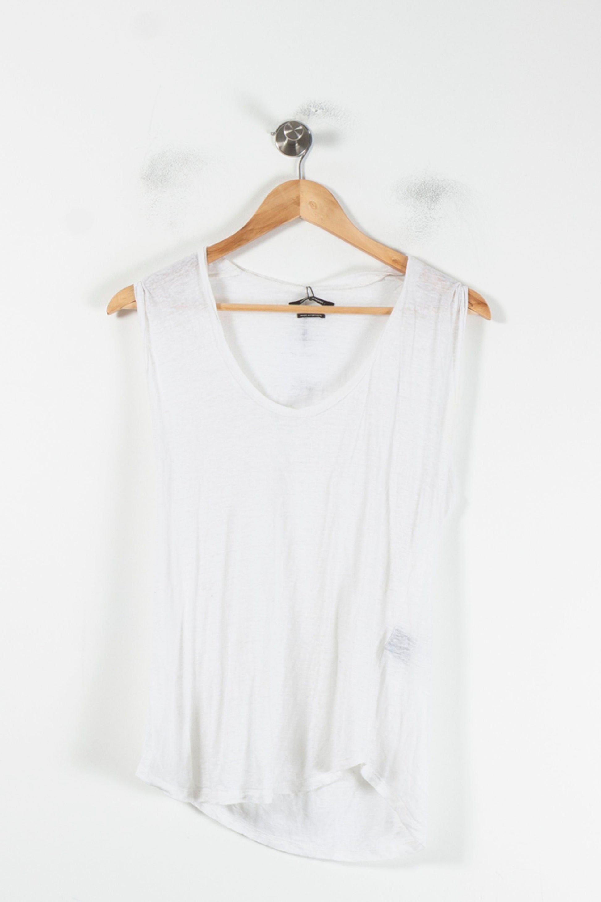 Top sans manches blanc Isabel Marant, taille M/38, coupe fluide à encolure dégagée. Son tissu léger laisse deviner une transparence délicate, tandis que sa finition légèrement asymétrique au bas du vêtement lui confère une note moderne et décontractée. Ce top sera parfait pour une journée estivale, associé à un pantalon chic ou un short pour un look simple et élégant.