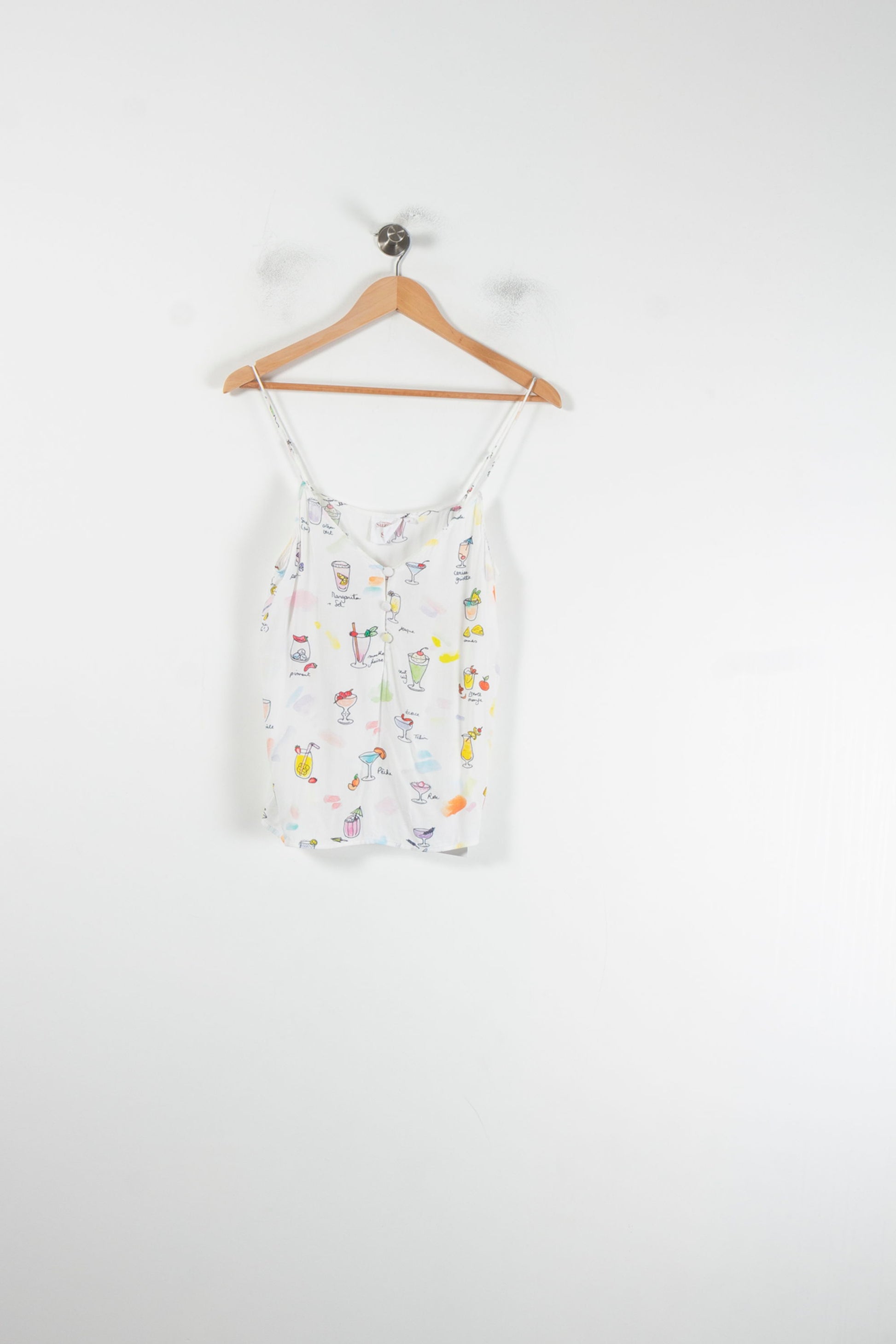 Top à fines bretelles imprimé cocktails Soi Paris, taille M/38, blanc. Confectionné en 100% viscose, il séduit par sa légèreté et son imprimé original représentant des cocktails multicolores, apportant une touche ludique et raffinée à votre tenue. Idéal pour une journée estivale ou un apéritif entre amis.