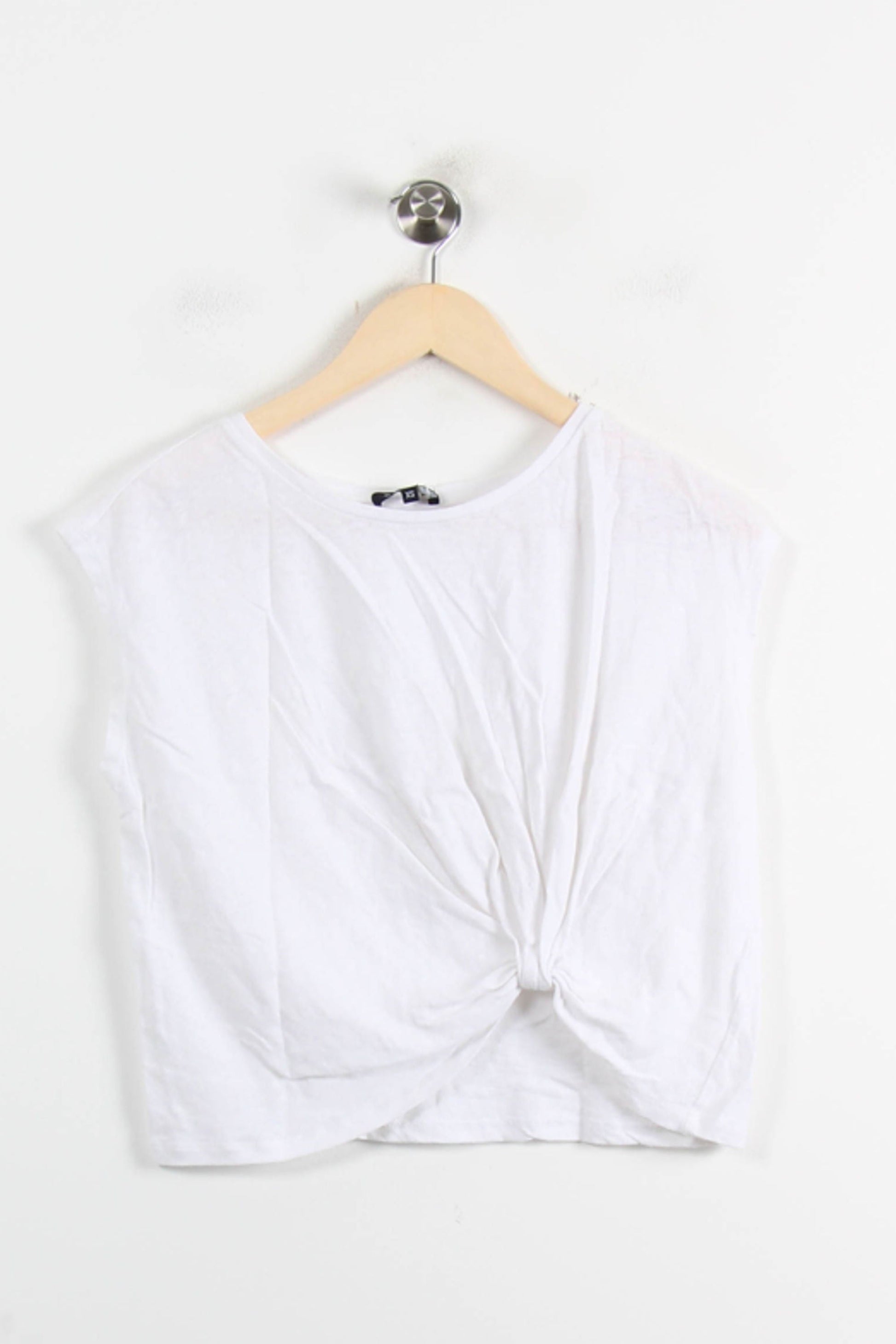Top blanc à nœud sur le devant, taille XS/34, de la marque Caroll. Confectionné dans une matière légère, ce haut se distingue par son détail noué à l'avant, qui lui confère une allure moderne et ajoute du relief à une silhouette épurée. Idéal pour une journée décontractée ou un rendez-vous estival, il s'associe facilement avec un jean ou une jupe.