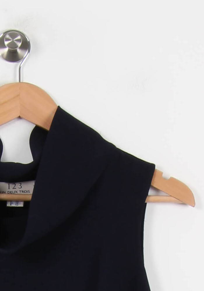 Top sans manches bleu de la marque Maison 123, taille L/40 – un incontournable raffiné pour votre dressing. Confectionné dans une matière au tombé fluide, ce modèle se distingue par son col large façon col cheminée qui confère une allure élégante et moderne. Idéal pour une journée au bureau, il se porte aisément avec un pantalon tailleur ou une jupe droite pour une touche sophistiquée.