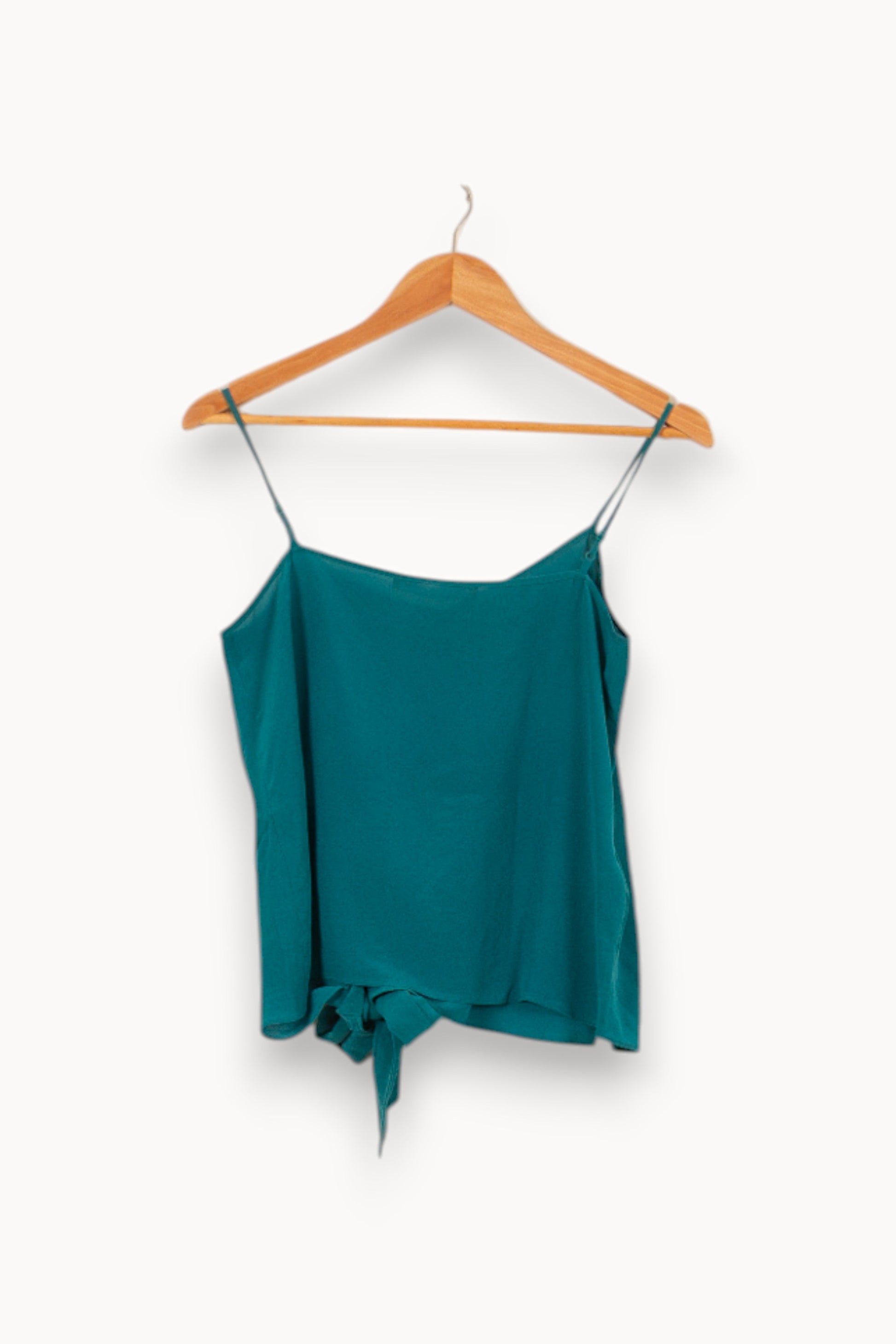 Top à fines bretelles bleu Comptoir des Cotonniers, taille S/36, élégant et moderne. Confectionné dans une matière fluide, il se distingue par sa coupe simple agrémentée d’un nœud délicat sur le bas, lui apportant une touche de féminité et de singularité. Idéal pour une sortie estivale ou une rencontre décontractée entre amis.