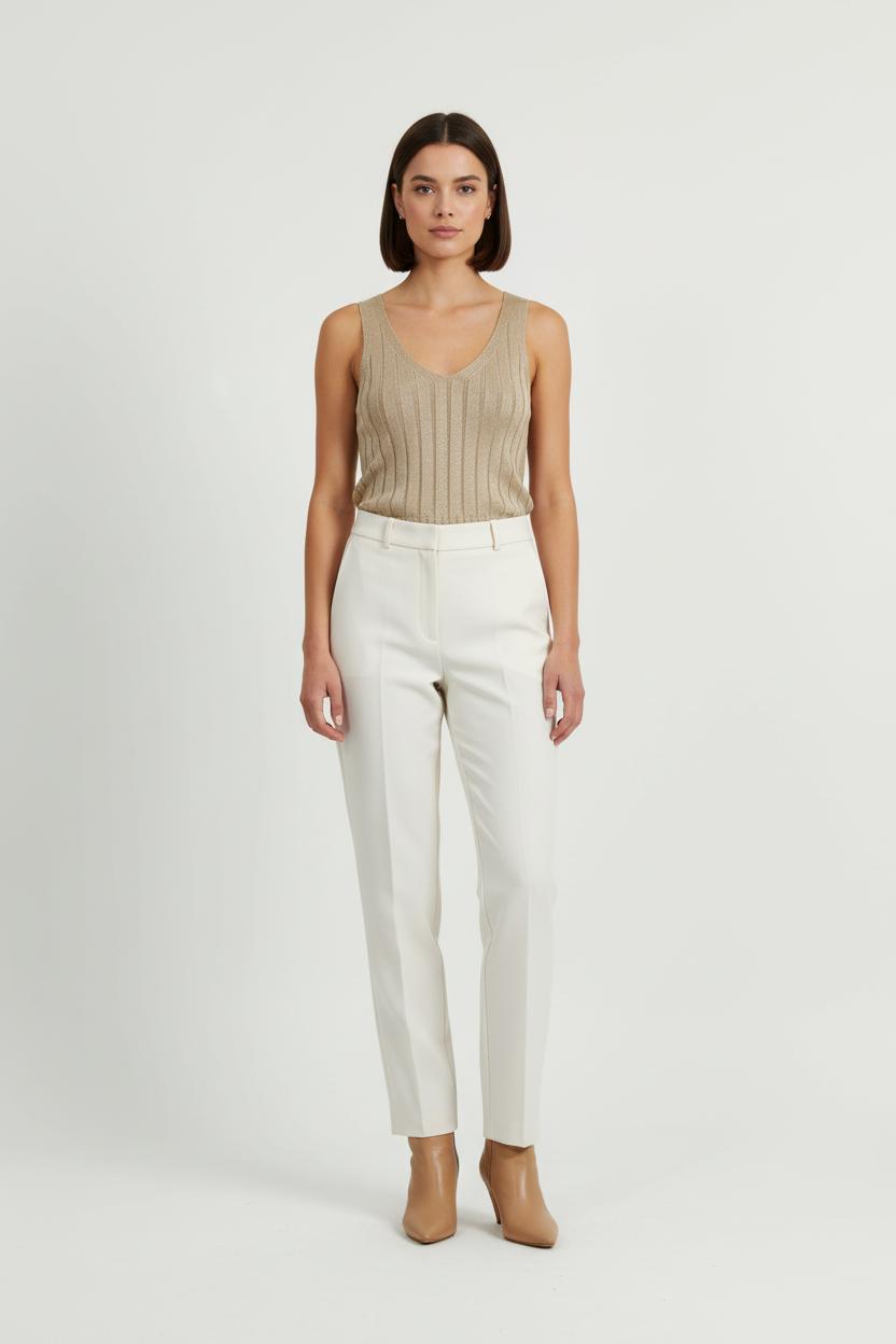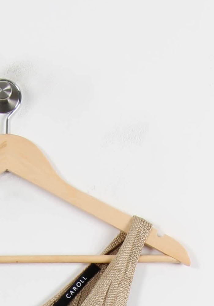 Top sans manches doré, taille M/38 de la marque Caroll, arborant une coupe près du corps et un élégant décolleté en V. Confectionné dans une maille côtelée à l’aspect légèrement scintillant, ce modèle se distingue par sa texture raffinée et ses finitions soignées, apportant une allure sophistiquée à tout look. Idéal pour une soirée estivale ou un dîner élégant, porté avec un pantalon fluide ou une jupe taille haute.