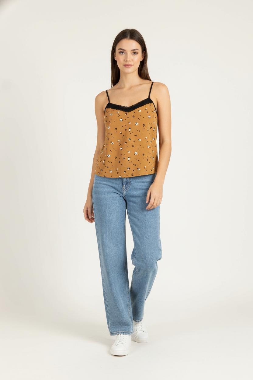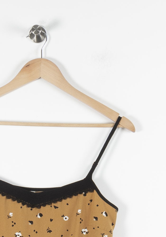 Top à bretelles fines multicolore, imprimé fleuri I.Code, taille XS/34. Confectionné en 100% polyester, ce modèle se distingue par son imprimé floral délicat sur fond moutarde et une finition en dentelle noire au col, apportant une touche subtile d'élégance. Idéal pour une journée estivale ou une sortie décontractée entre amis.