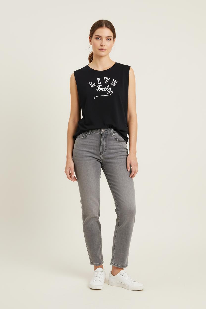 Top sans manches bleu IKKS "LIVE Freely", taille L/40, au design casual et moderne. Confectionné dans une matière légère et confortable, ce top présente une inscription contrastante sur le devant, soulignant son style affirmé et original. Parfait pour une journée décontractée en ville ou un week-end entre amis.