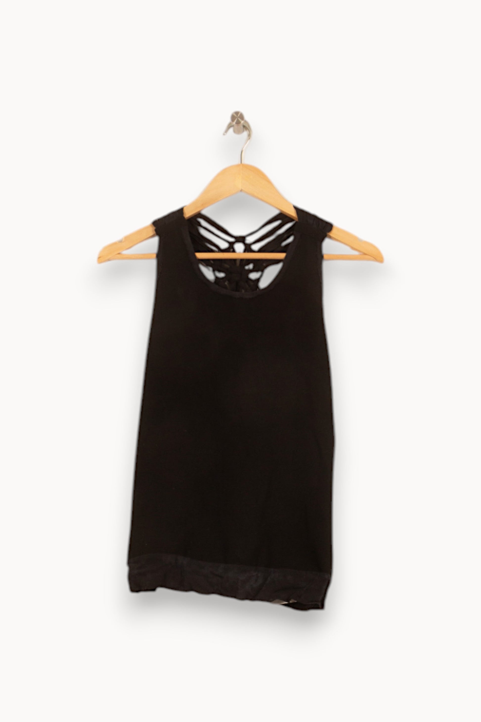 Top noir sans manches Maje, taille M/38, au design moderne et épuré. Ce modèle se distingue par son dos ajouré à détails entrelacés, apportant une touche d’originalité et de raffinement à la silhouette. Idéal pour une soirée élégante ou un dîner entre amis, il allie sophistication et confort.