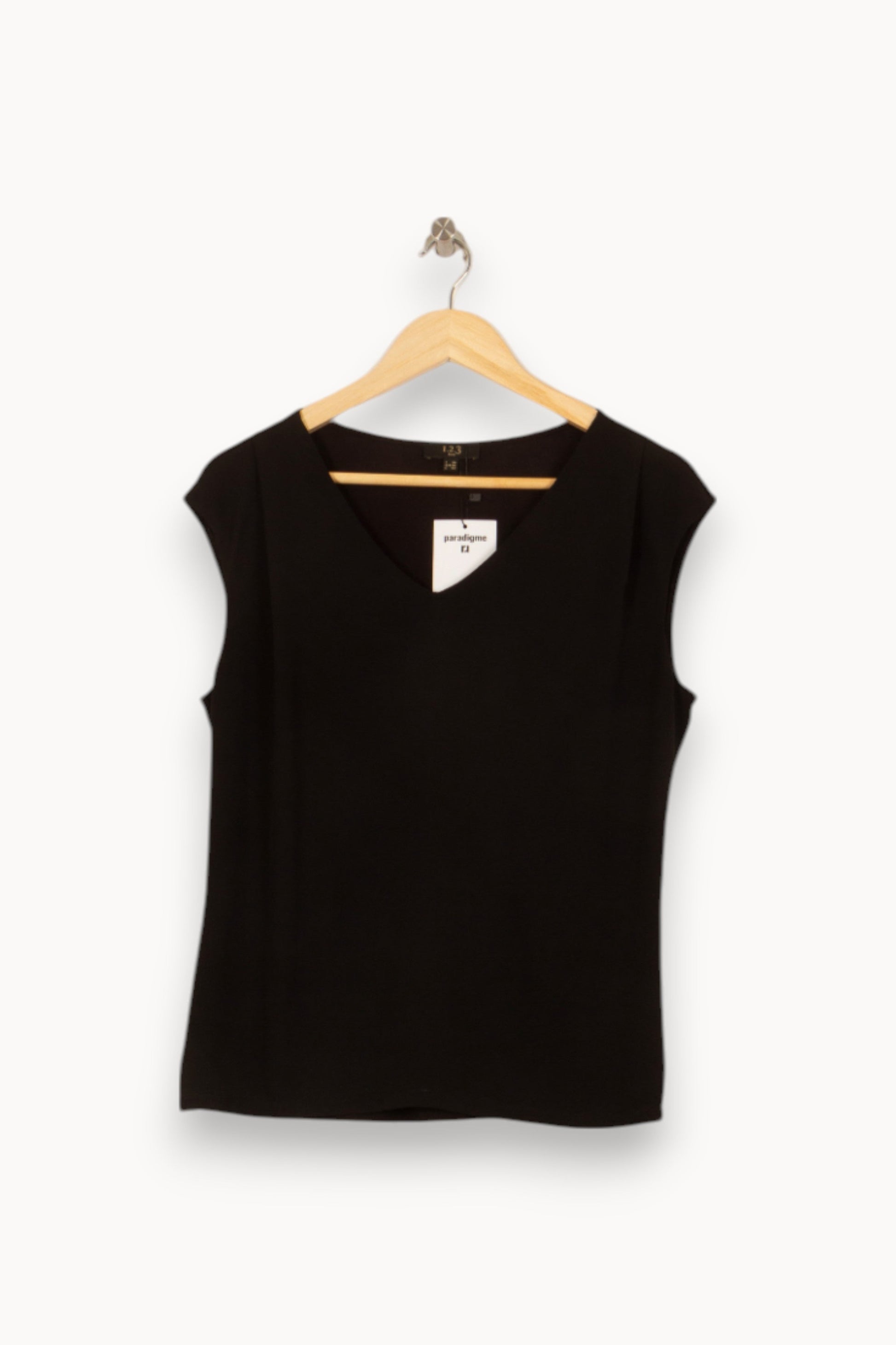 Top sans manches noir Maison 123, taille M/38, à encolure en V. Son tissu noir uni offre une allure élégante et intemporelle, tandis que la coupe épurée et le décolleté en V confèrent modernité et raffinement à ce modèle. Idéal pour un rendez-vous professionnel ou une soirée chic, ce top saura parfaitement s’adapter à vos tenues de journée comme de soirée.
