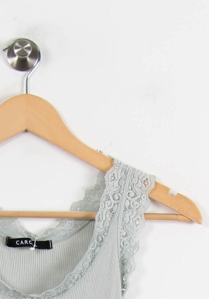 Top sans manches Caroll vert taille M/38, élégant et raffiné, idéal pour sublimer votre quotidien. Confectionné dans une maille côtelée légère, il se distingue par ses larges bretelles en dentelle délicate, apportant une touche féminine et unique à ce basique revisité. Parfait pour un déjeuner en terrasse ou un après-midi estival entre amis.