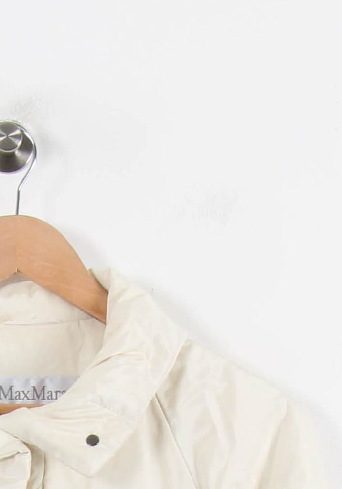 Manteau blanc Max Mara, taille L/40, alliant élégance et simplicité pour une silhouette intemporelle. Confectionné dans une matière à l’aspect doux et légèrement matelassé, ce manteau se distingue par son col montant, ses finitions épurées et sa fermeture dissimulée qui apporte une note raffinée. Idéal pour vos journées hivernales en ville ou pour sublimer une tenue professionnelle avec un éclat subtil.
