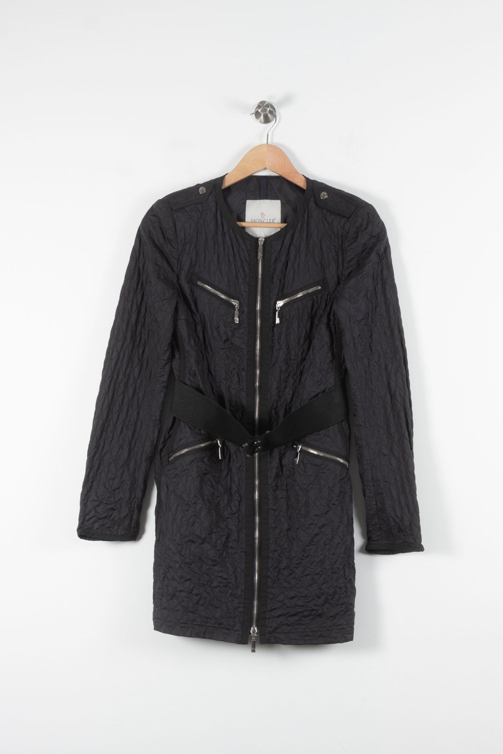 Manteau Moncler noir taille S/36 – Ce manteau élégant de la marque Moncler présente une coupe structurée, rehaussée par des détails zippés argentés et une ceinture à la taille. Confectionné en 80% polyamide et 20% polyester, il offre une texture matelassée raffinée et légère qui confère au vêtement un style contemporain et sophistiqué. Parfait pour une promenade en ville ou une sortie chic entre amis lors des journées fraîches.
