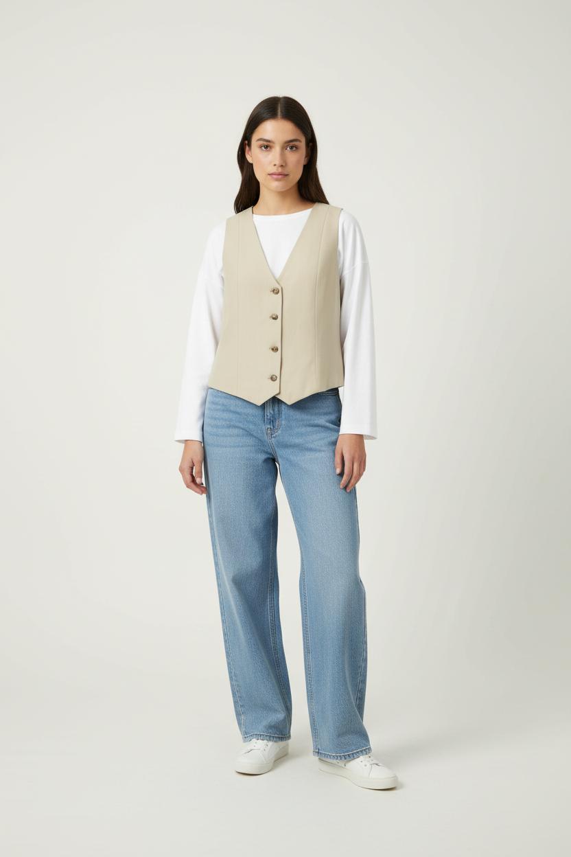 Gilet sans manches beige Grace & Mila, taille L/40, parfait pour une allure élégante et décontractée. Composé à 77% de viscose et 23% de polyester avec une doublure 100% acétate, ce gilet présente une coupe structurée et des boutons discrets sur le devant qui lui confèrent un style moderne et raffiné. Idéal à porter lors d’un déjeuner en ville ou pour dynamiser une tenue basique au bureau.