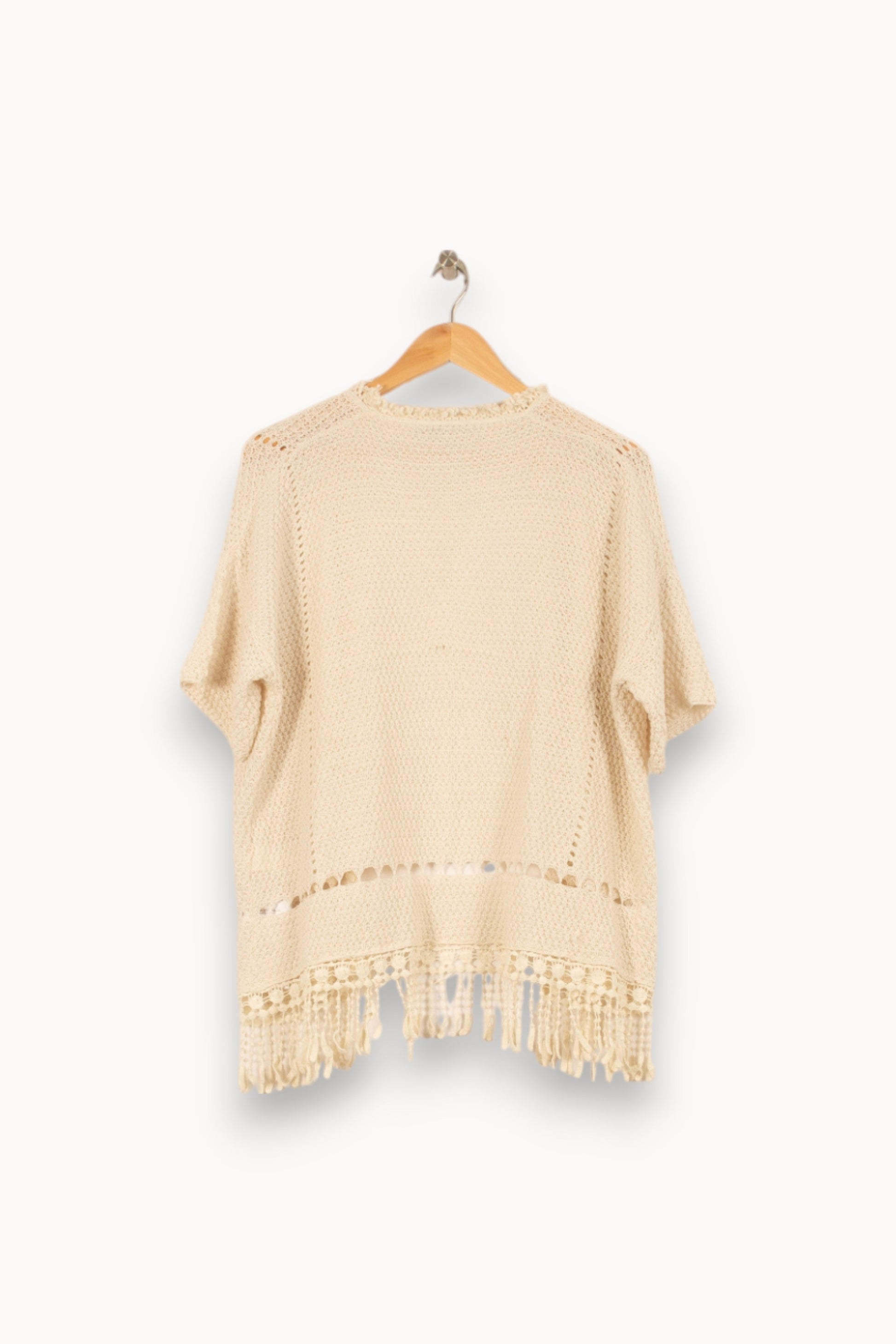 Cardigan écru à manches courtes La Fée Maraboutée, taille XS/34, parfait pour un look délicat et féminin. Ce modèle en maille présente une finition ajourée et des franges en bas, lui conférant une allure bohème raffinée et distincte. Idéal pour une promenade printanière ou une soirée estivale décontractée.