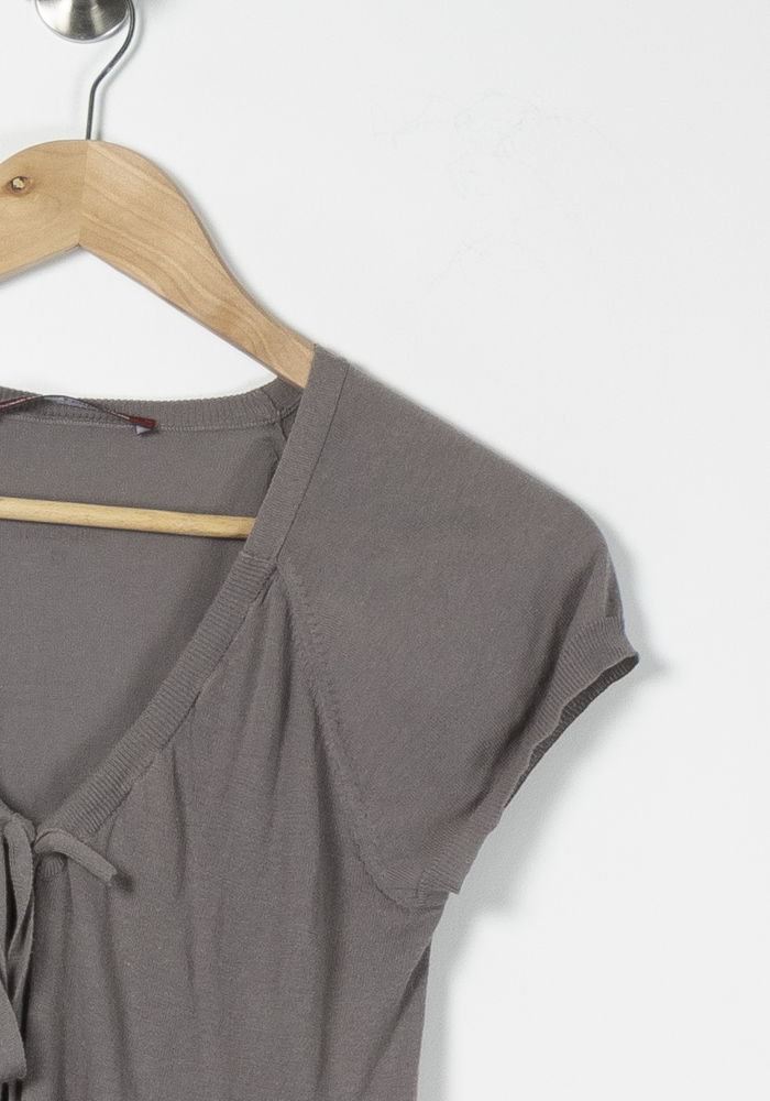 Pull gris Comptoir des Cotonniers en taille M/38, à la coupe fluide et à manches courtes, idéal pour un look casual-chic. La matière légère (composition inconnue) et les deux poches plaquées apportent confort et praticité, tandis que le lien à nouer sur le devant et l'encolure en V signent l’originalité du modèle. Parfait pour une journée décontractée au bureau ou un après-midi en ville.