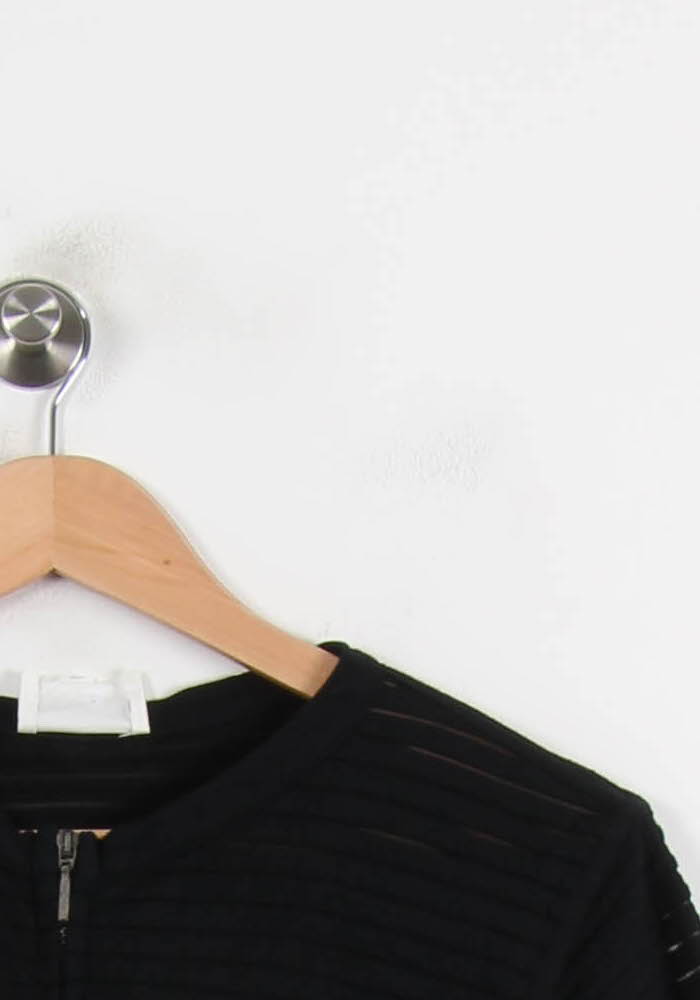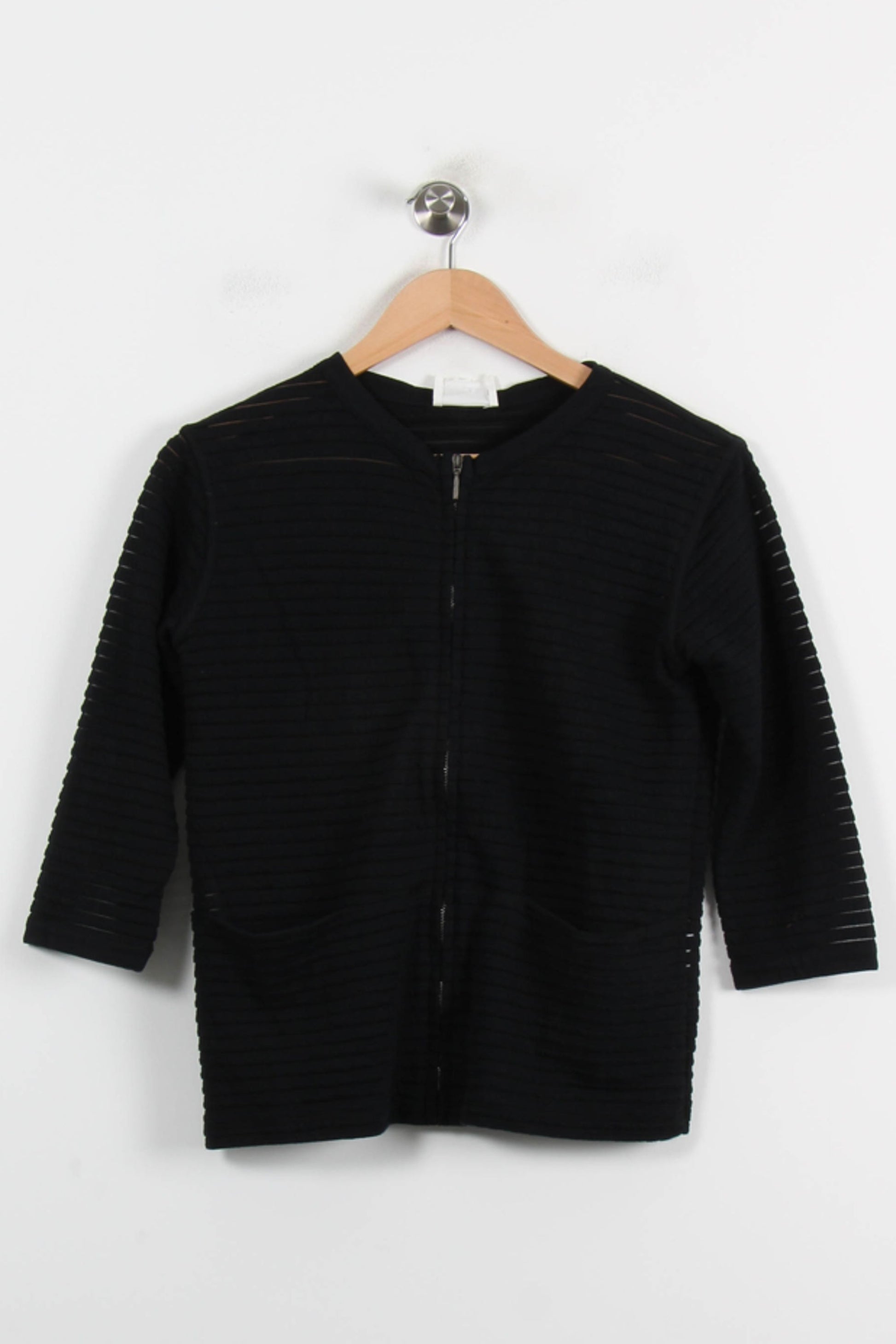 Cardigan noir zippé Maison 123, taille M/38, idéal pour un look élégant et intemporel. Confectionné dans une matière texturée à fines rayures horizontales, ce cardigan présente des manches trois-quarts et deux poches plaquées qui lui confèrent une touche moderne et raffinée. Parfait pour compléter une tenue professionnelle ou agrémenter une sortie citadine en toute simplicité.