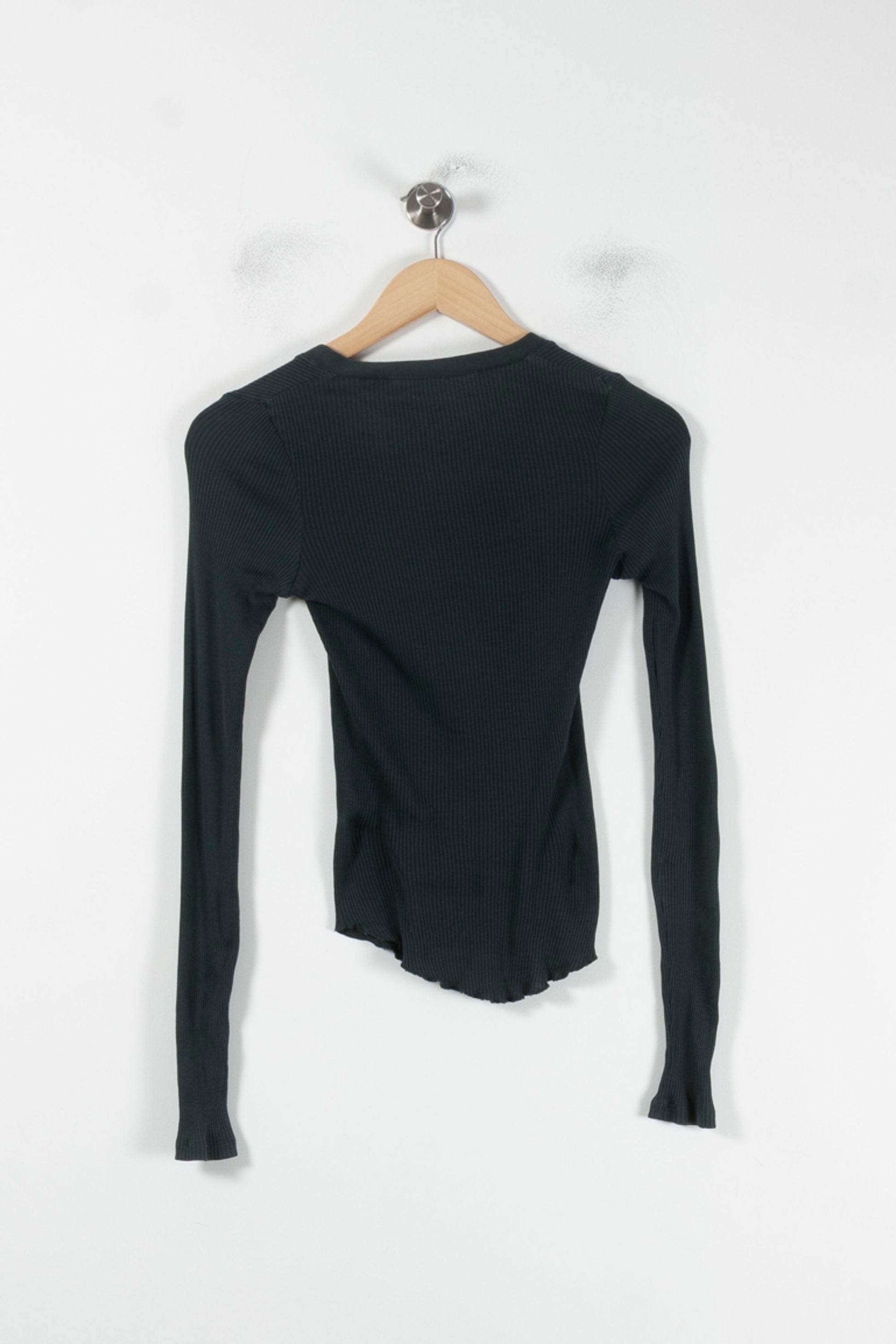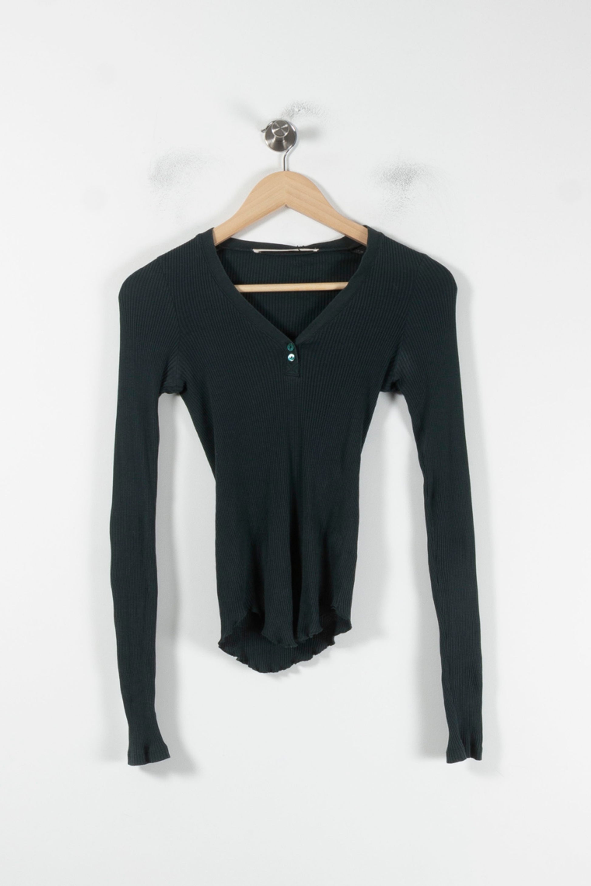 Top vert manches longues IKKS, taille XS/34, parfait pour une allure casual raffinée. Confectionné en 100% coton, ce haut présente une maille côtelée, un col en V et une patte de boutonnage à deux boutons qui lui apportent une touche de caractère et de modernité. Idéal pour un look confortable et élégant lors d'une journée décontractée ou d'une sortie entre amis.