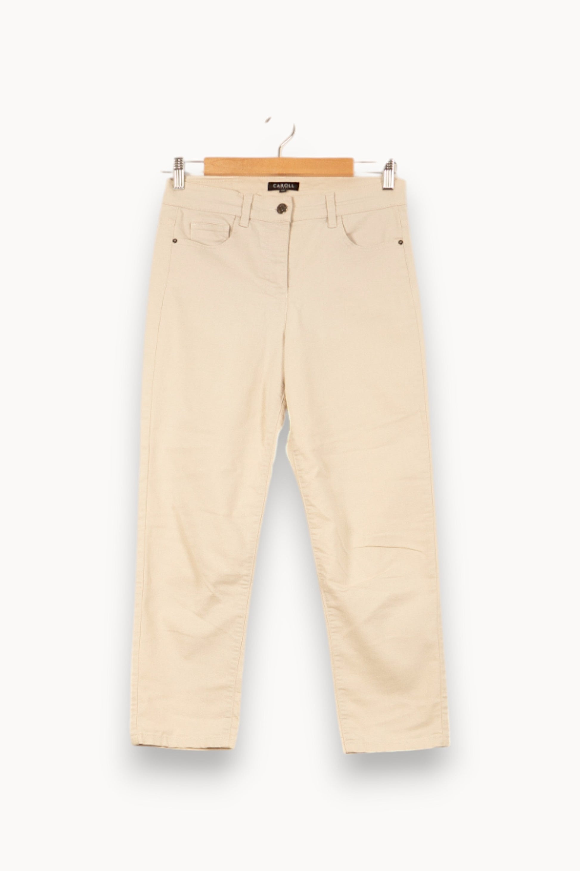 Pantalon beige Caroll taille S/36, élégance intemporelle et allure raffinée. Confectionné dans une matière douce au toucher, ce pantalon se distingue par une coupe classique rehaussée de détails soignés comme les poches en biais et une finition moderne au niveau de la taille. Idéal pour une journée professionnelle ou un déjeuner en terrasse en toute décontraction.