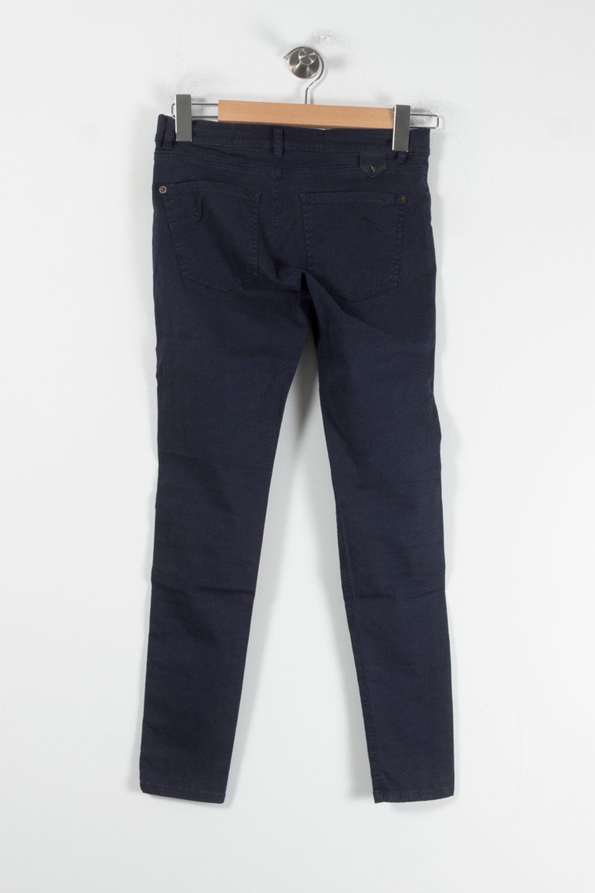 Pantalon slim bleu IKKS taille XXS/32, parfait pour une silhouette élégante et contemporaine. Confectionné dans une matière souple dont la texture raffinée et la coupe ajustée apportent une touche moderne à ce pantalon, il se distingue par sa simplicité rehaussée de finitions soignées. Idéal pour une journée de travail ou une sortie citadine où style et confort sont de mise.