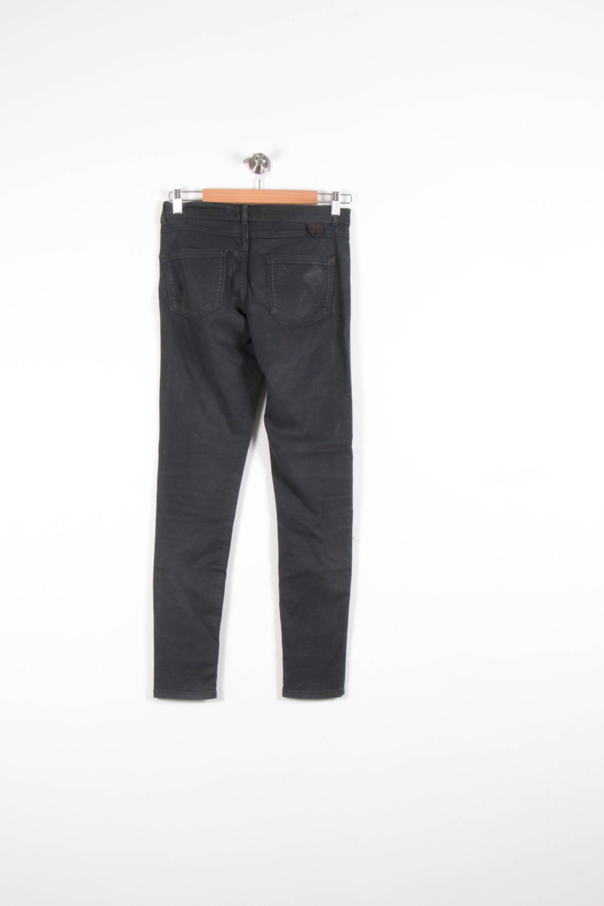 Jean skinny noir IKKS, taille S/36, alliant style moderne et silhouette élancée. Confectionné dans une matière extensible de qualité assurant confort et maintien, il se distingue par sa coupe ajustée et un détail de cordon sur le passant avant qui ajoute une note originale à l’ensemble. Parfait pour une journée de travail ou une soirée décontractée, associé à un blazer ou un pull élégant.