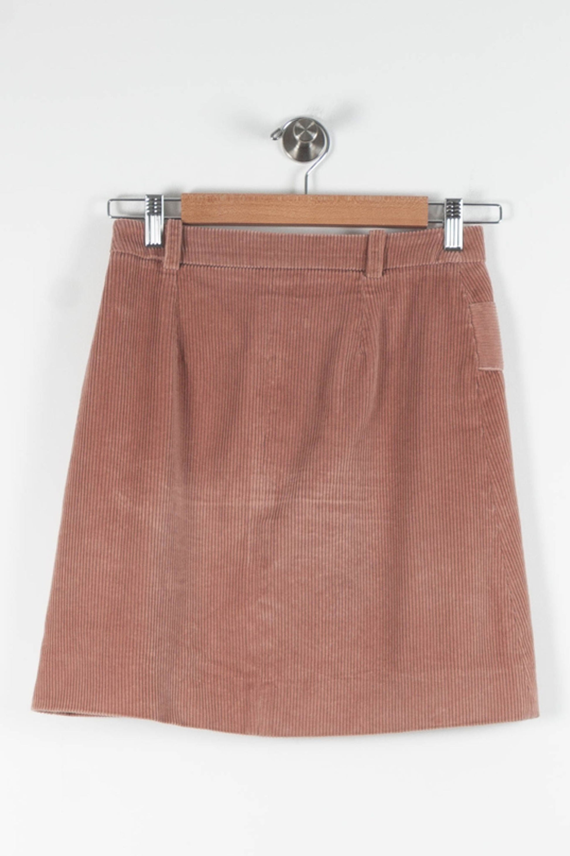 Jupe Caroll en velours côtelé rose, taille XS/34, boutonnée sur le devant avec effet ceinture pour une silhouette structurée. Confectionnée dans un velours côtelé au toucher doux, cette pièce se distingue par sa texture raffinée, ses larges boutons effet corne et son empiècement en V à la taille, signature d’un style vintage-chic. Parfaite pour une journée de bureau avec un pull fin ou un brunch entre amies pour une allure élégante et décontractée.