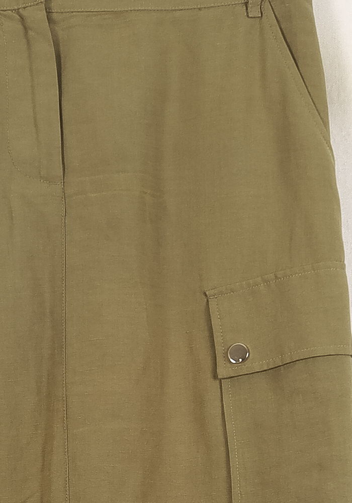 Jupe mi-longue verte Caroll, taille M/38 : élégance et fonctionnalité réunies. Confectionnée dans une matière légère à l'aspect naturel, cette jupe se distingue par ses grandes poches à rabat boutonné sur les côtés, son ouverture frontale, ainsi que ses finitions soignées qui lui confèrent un style moderne et pratique. Parfaite pour une journée de travail ou une escapade urbaine, elle s’adapte aisément à un look casual-chic.