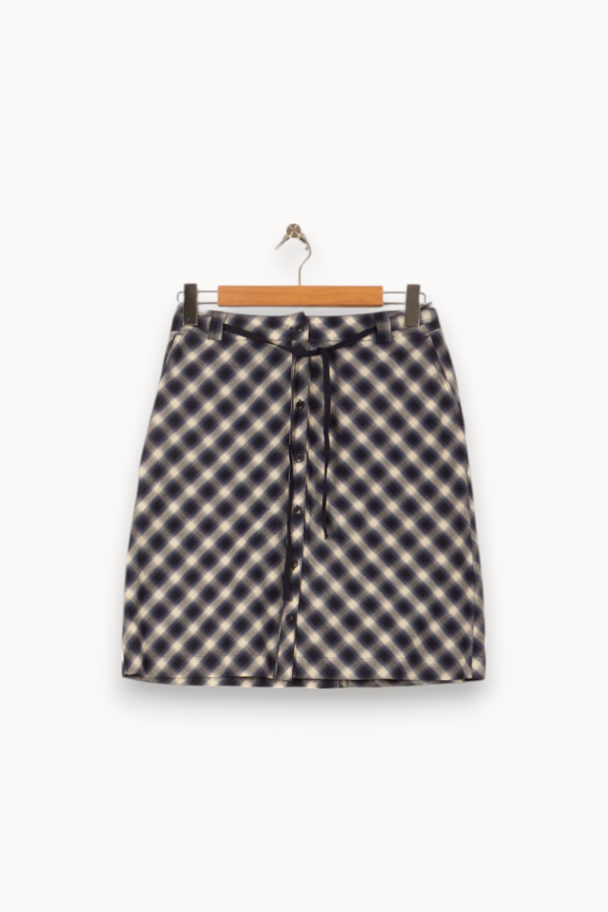 Jupe courte à carreaux bleu Caroll en taille M/38, élégante et moderne, idéale pour compléter votre garde-robe de saison. Confectionnée dans une matière douce mettant en valeur un motif à carreaux raffinés et dotée d’une fermeture boutonnée sur le devant ainsi que d’une ceinture à nouer à la taille, cette jupe se distingue par la simplicité de ses lignes et l’originalité de son imprimé. Parfaite pour une journée au bureau ou un déjeuner entre amis, elle accompagnera facilement vos tenues du quotidien avec style.