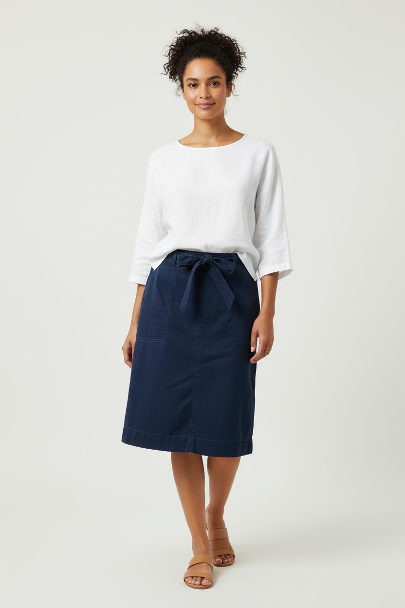 Jupe droite bleu marine Maison 123, taille L/40, élégante et intemporelle. Confectionnée en 100% coton, cette jupe se distingue par sa ceinture à nouer à la taille et ses larges poches plaquées, offrant une note de raffinement tout en gardant un esprit pratique. Parfaite pour un look chic au bureau comme pour une sortie en ville lors des beaux jours.