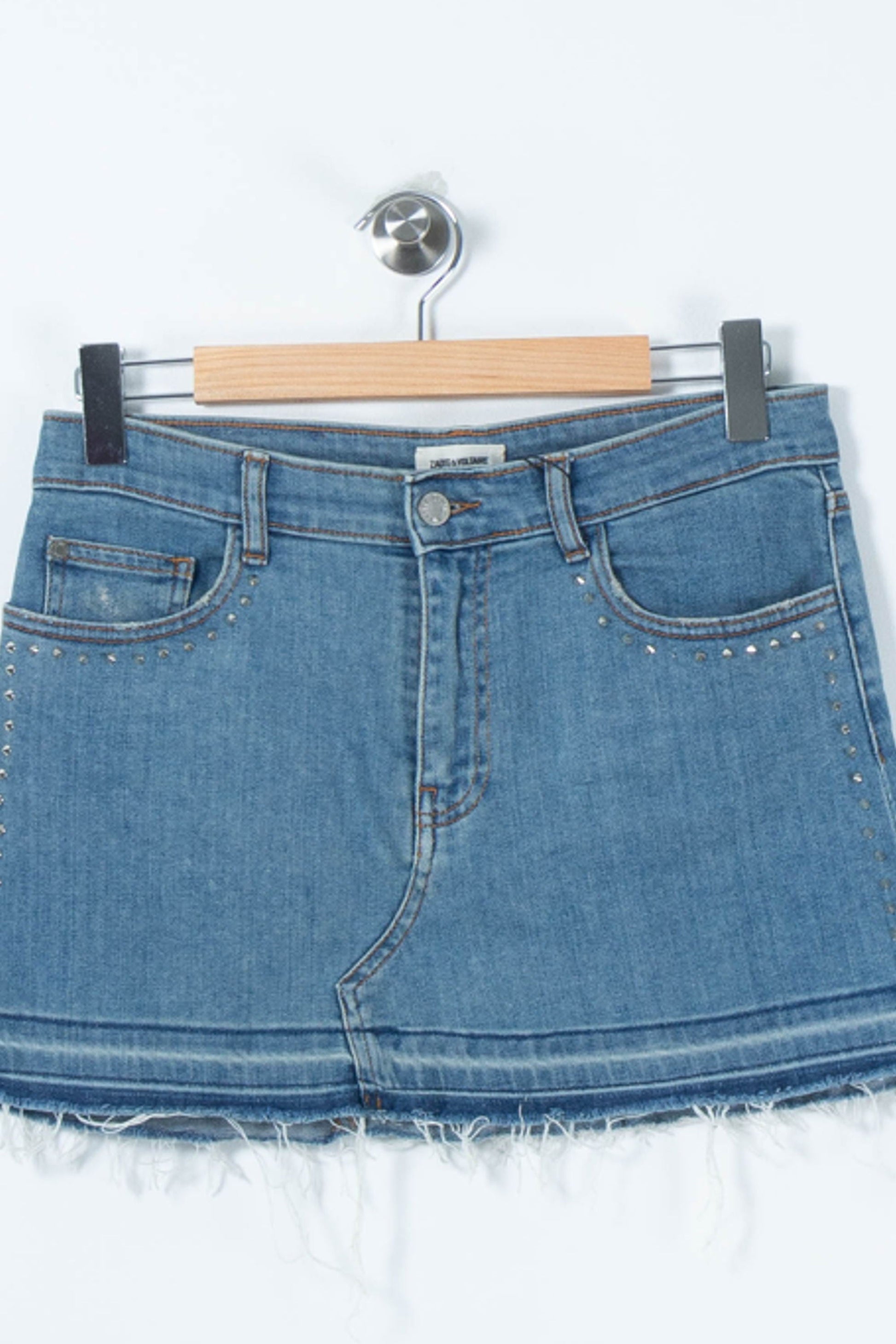 Jupe en jean bleu Zadig&Voltaire taille M/38, ornée de petits rivets argentés sur les côtés et finie par un ourlet effiloché pour un style décontracté chic. Confectionnée dans un tissu principal composé à 98% de coton et 2% d'élasthanne, elle offre à la fois confort et légèreté, tandis que les détails métalliques et l’effet usé soulignent sa modernité. Parfaite pour une sortie en ville ou un week-end estival, cette jupe s’accorde aisément à un look casual et tendance.