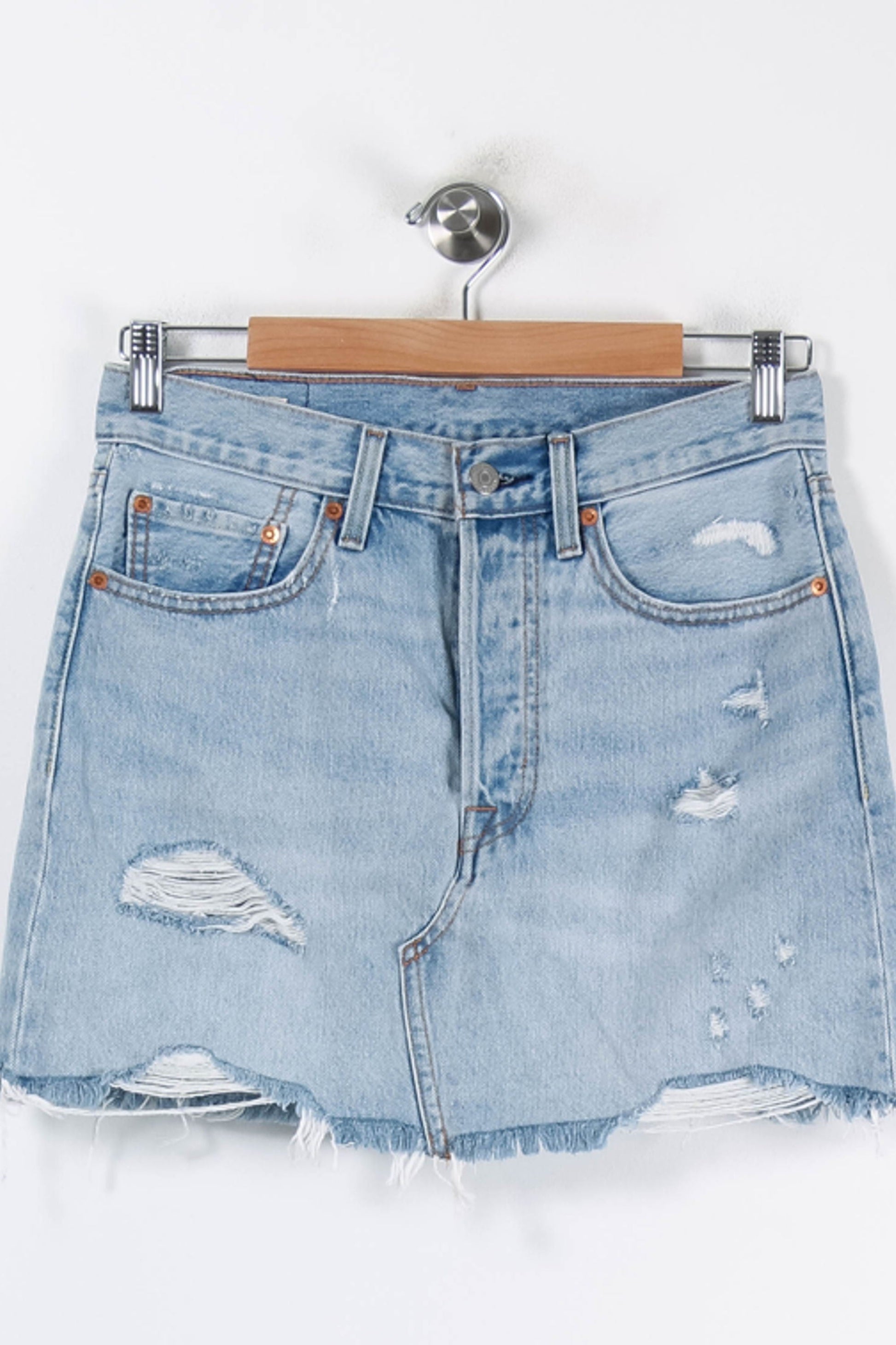 Jupe en jean Levi’s - Taille S/36 - Bleu : Cette jupe en jean de la marque Levi’s, en taille S/36, séduit par son coloris bleu clair et son design contemporain. Son effet usé marqué par des déchirures apparentes et des bords effilochés lui confère un caractère authentique et tendance, idéal pour un style décontracté et moderne. Parfaite pour une sortie estivale entre amis ou un après-midi en ville.