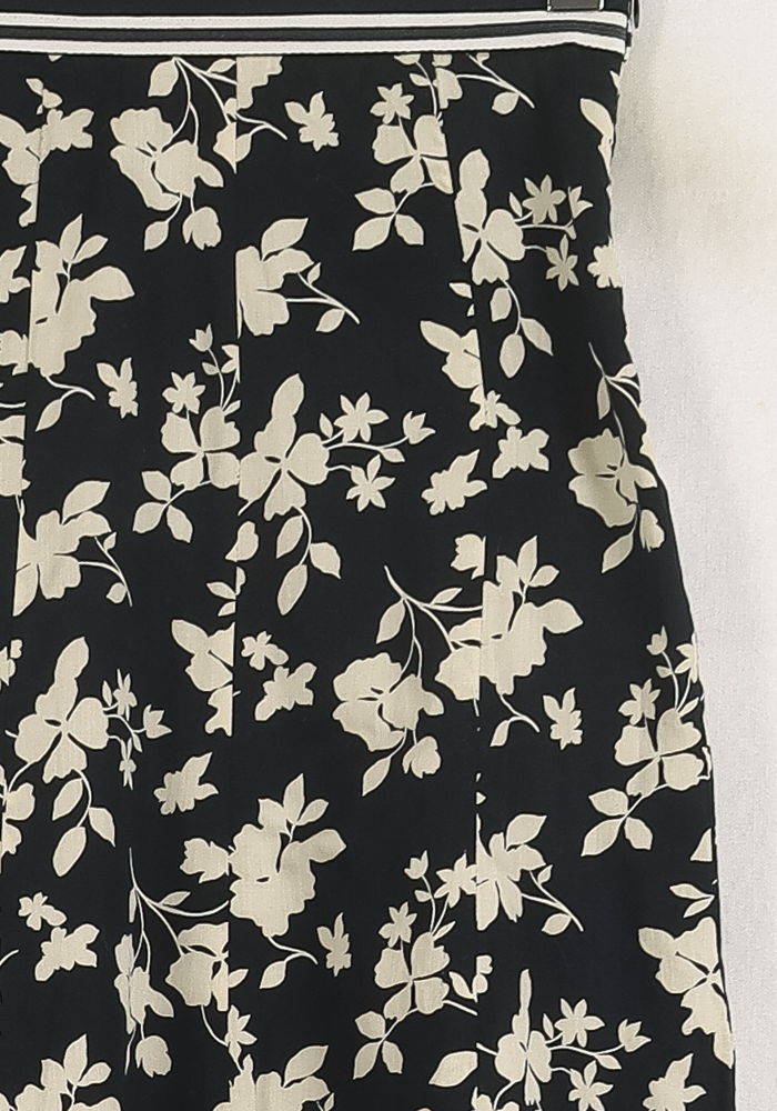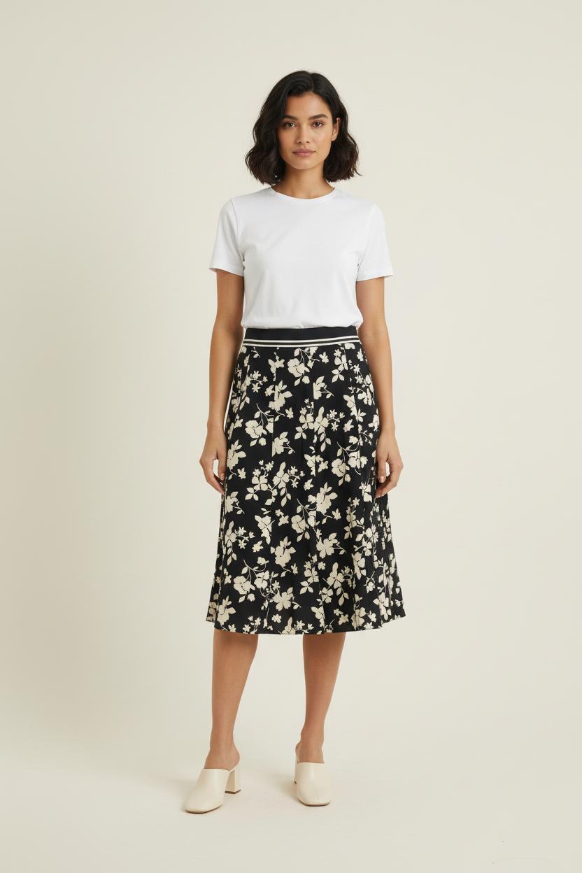 Jupe midi multicolore à imprimé floral, taille M/38, signée Caroll. Confectionnée dans une matière fluide, cette jupe se distingue par son motif floral élégant noir et blanc, ainsi que sa ceinture contrastée à fines rayures, lui apportant une touche graphique unique. Idéale pour une journée au bureau ou un déjeuner en terrasse, elle s'associe facilement avec une blouse unie pour un look raffiné.