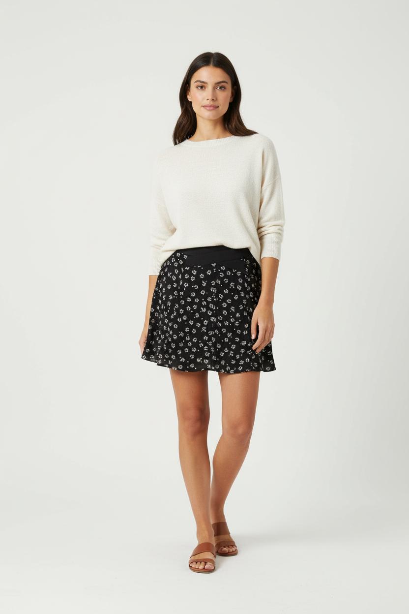 Jupe noire à imprimé fleuri, taille S/36, signée I.Code – une pièce élégante et féminine au motif délicat. Confectionnée en 100% viscose avec une doublure 100% polyester, cette jupe se distingue par sa coupe fluide et son imprimé floral blanc subtil qui apporte une touche de fraîcheur et d’originalité. Parfaite pour une journée au bureau ou un déjeuner en terrasse.