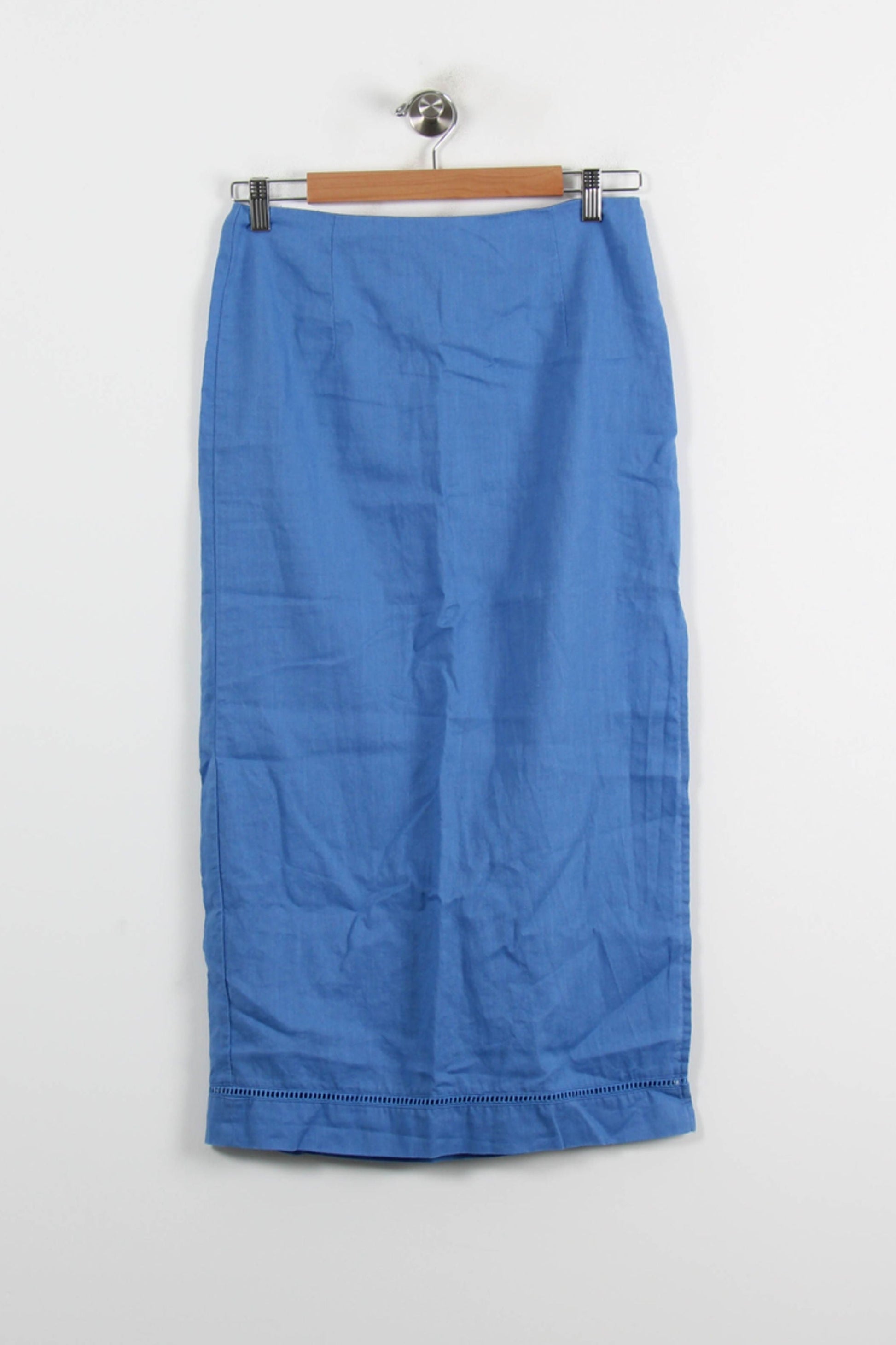 Jupe midi bleue Grace & Mila, taille M/38, au style épuré et moderne. Confectionnée dans un tissu léger et agréable, cette jupe se distingue par sa finition soignée et son détail subtil de surpiqûres ajourées en bas de pièce, apportant une touche d’élégance unique. Idéale pour une journée au bureau ou un déjeuner en ville, elle accompagne parfaitement un look raffiné et féminin.