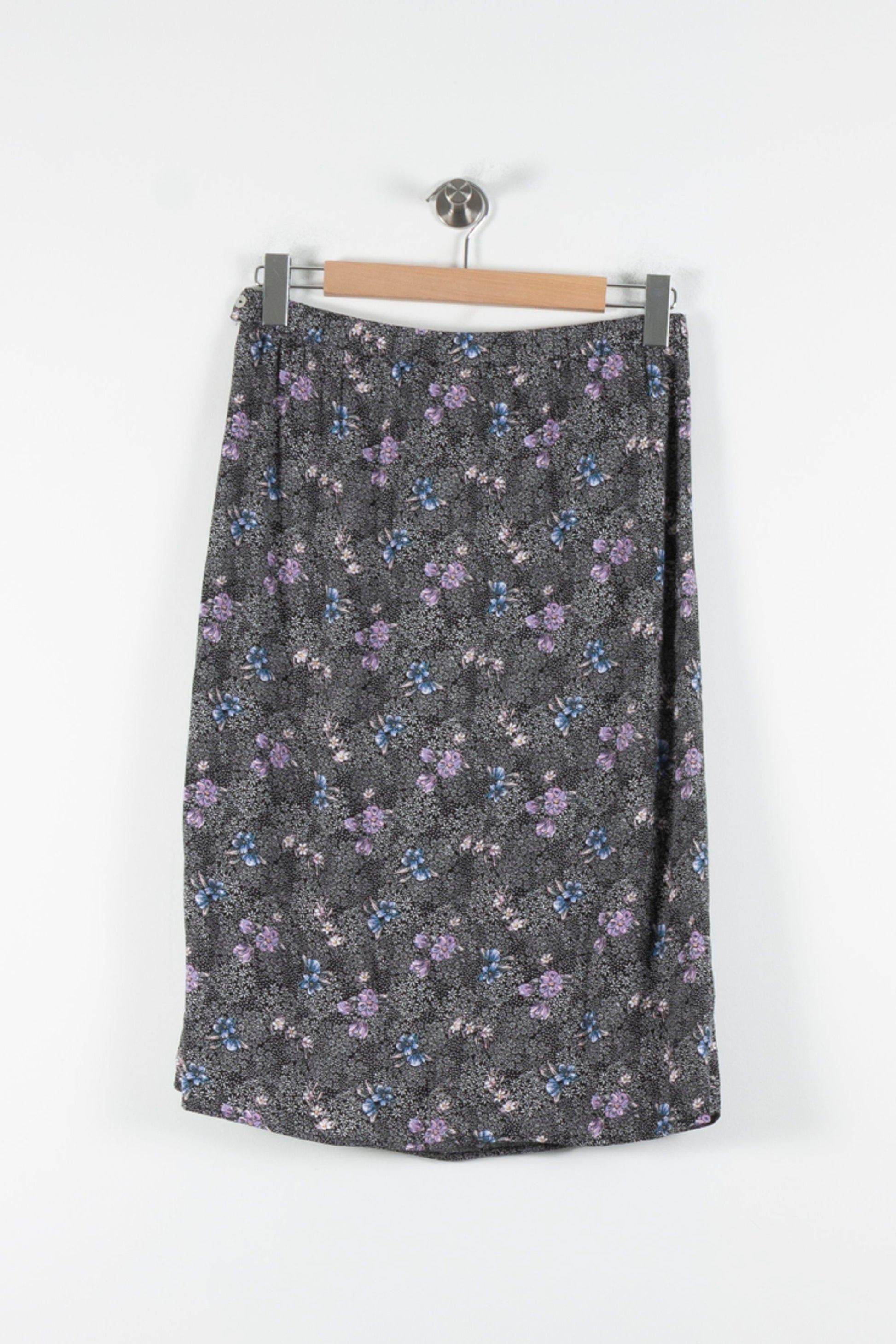 Jupe mi-longue à imprimé fleuri Karl Marc John, taille M/38, coloris gris. Confectionnée en 100% rayonne avec une doublure 100% viscose, cette jupe se distingue par sa légèreté et sa douceur, ainsi que son motif floral délicat aux touches de violet et bleu, offrant un charme intemporel. Parfaite pour une journée au bureau ou un déjeuner entre amis, elle s’adapte à toutes vos envies avec élégance.