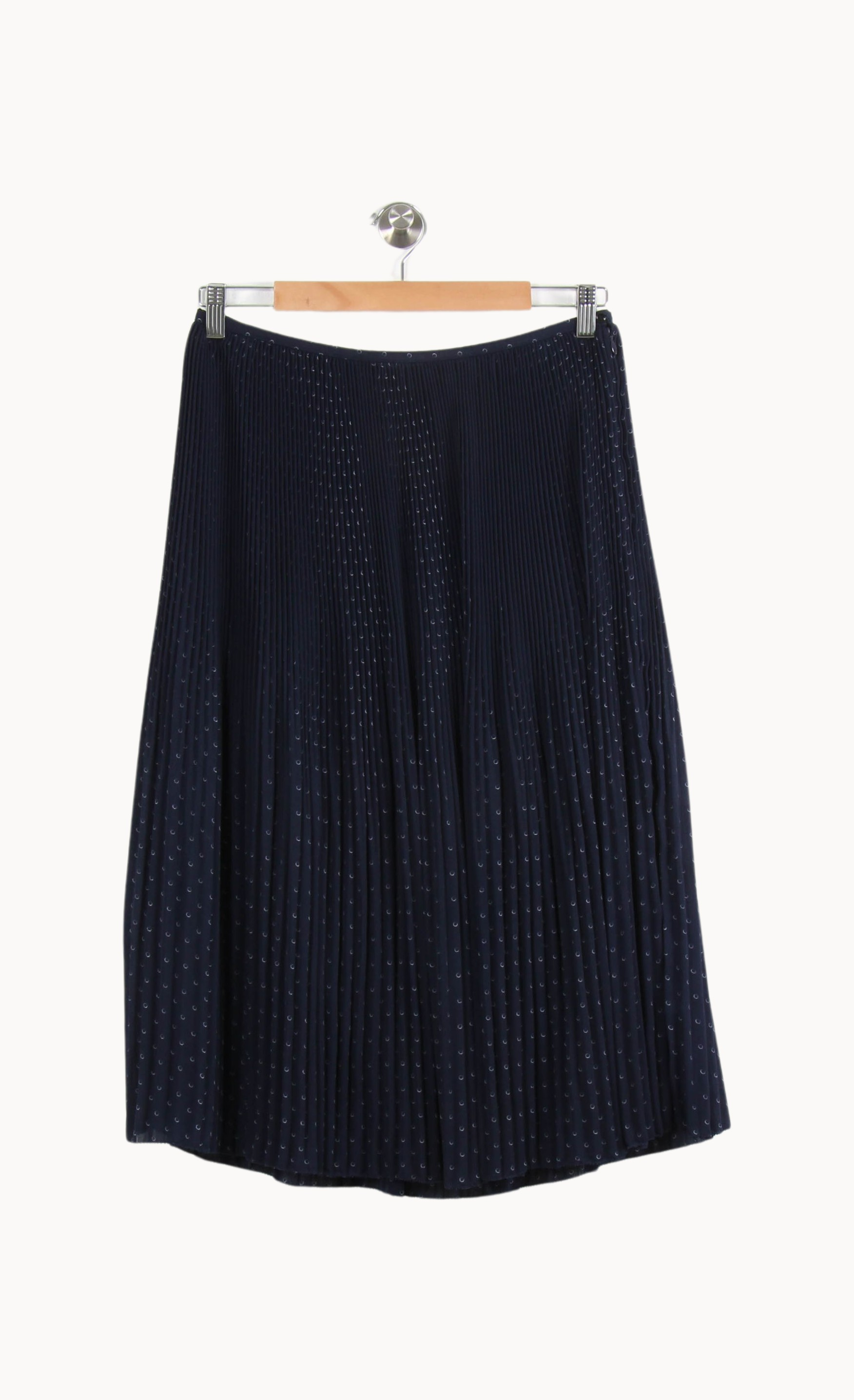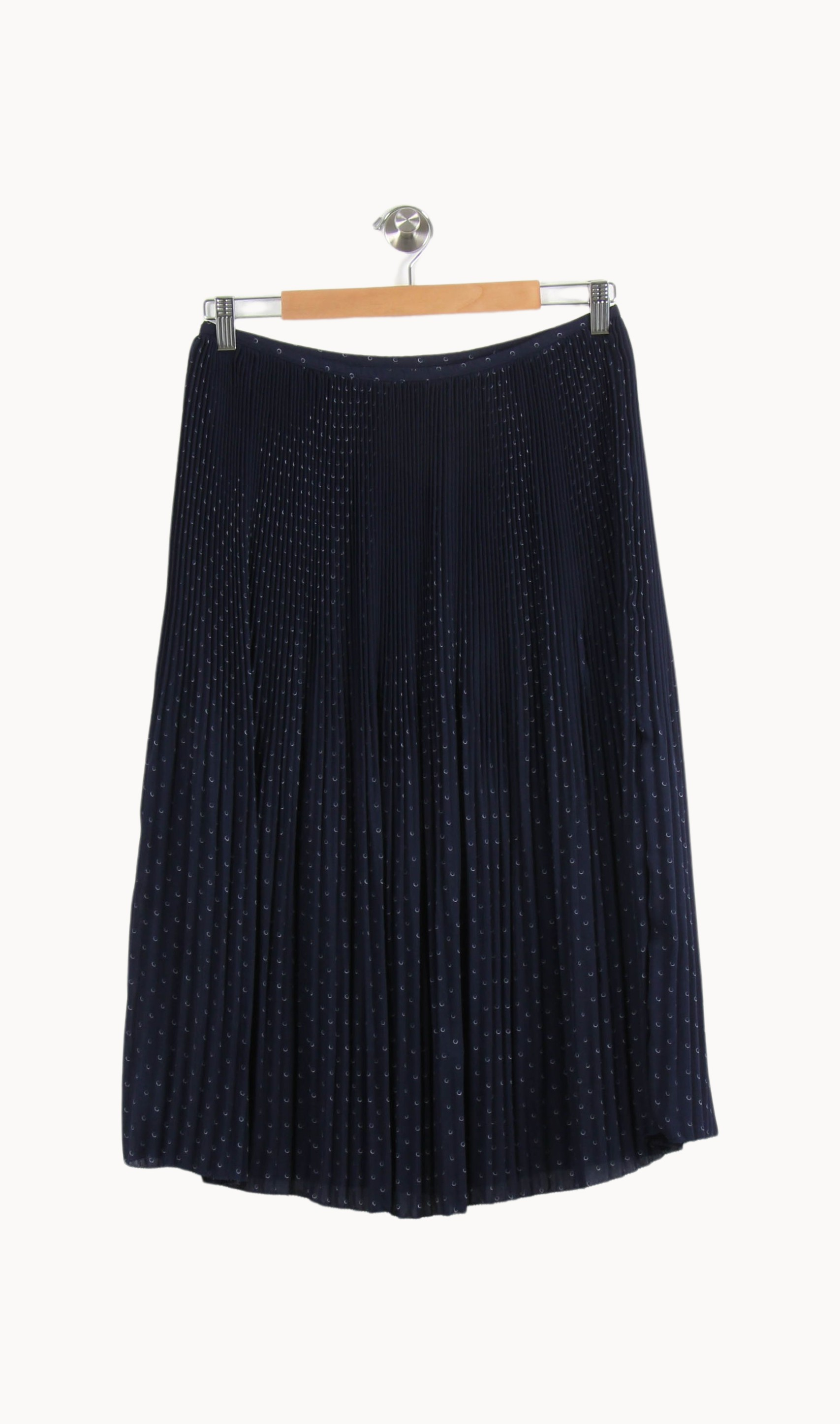 Jupe plissée bleu marine Comptoir des Cotonniers, taille L/40. Cette jupe se distingue par son tissu léger et fluide, agrémenté de plis réguliers et d’un motif discret à pois apportant une touche d’originalité et d’élégance. Idéale pour une journée au bureau ou un dîner entre amis, elle se porte facilement en toute occasion.