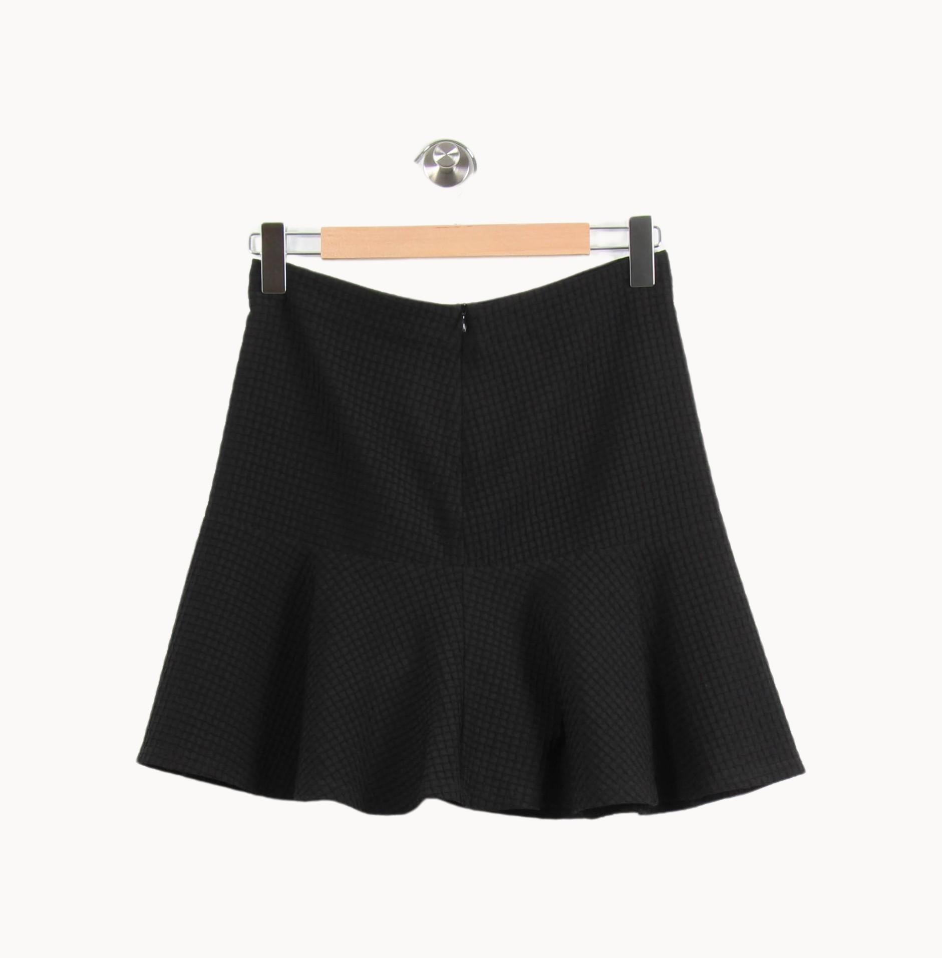 Jupe noire Comptoir des Cotonniers, taille M/38, coupe courte évasée. Réalisée dans une matière texturée à motif relief discret, cette jupe se distingue par sa finition volantée à la base qui structure élégamment la silhouette. Parfaite pour une journée de travail ou une sortie citadine, à associer avec un chemisier ou un pull ajusté.