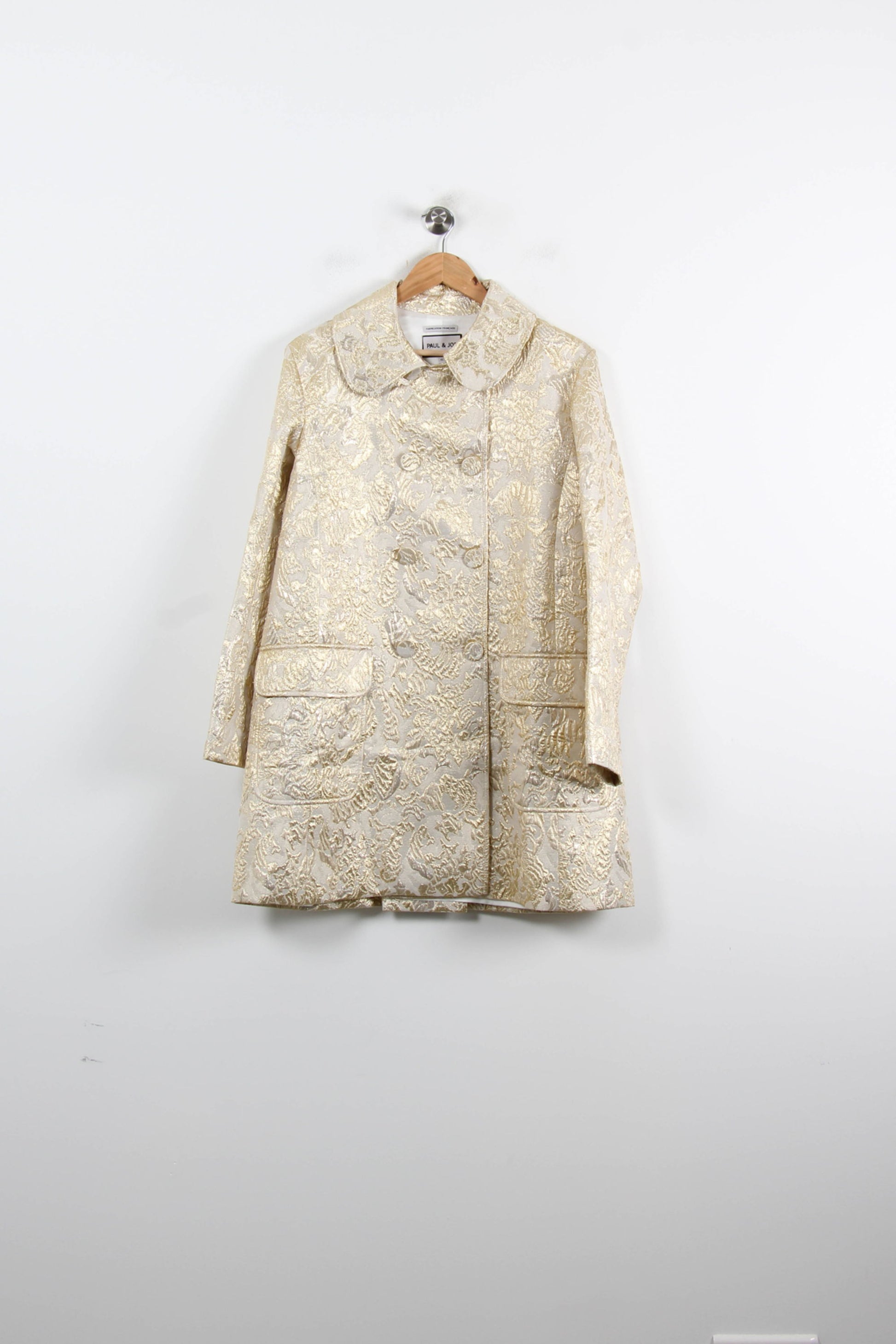 Manteau doré Paul & Joe, taille XL/42, à la coupe droite élégante avec grand col arrondi, idéal pour une allure sophistiquée. La matière offre une texture jacquard richement brodée de motifs floraux ton sur ton et apporte au vêtement éclat et raffinement, tandis que les boutons recouverts et les grandes poches plaquées accentuent son style unique. Ce manteau sera parfait pour sublimer une tenue lors d’un événement festif ou d’une soirée habillée.